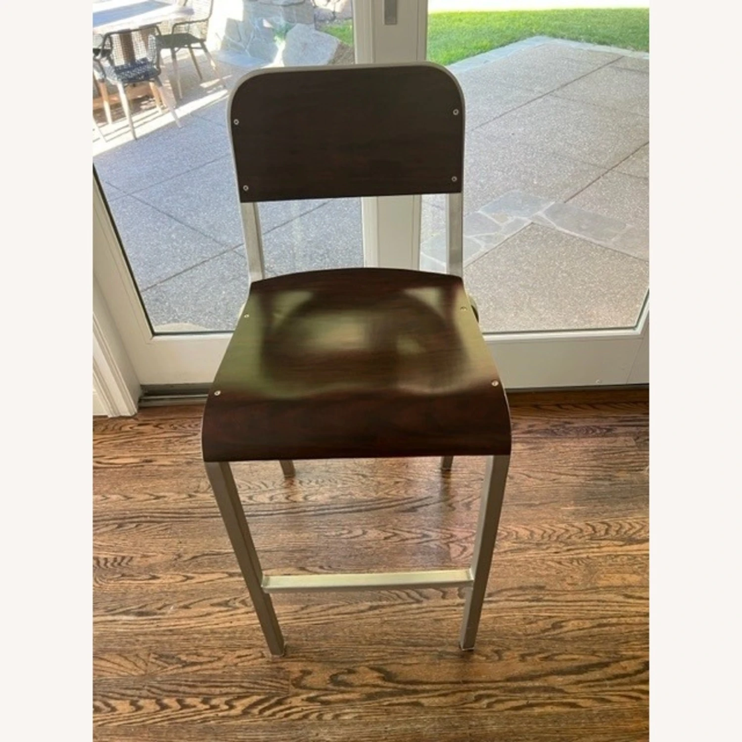 Seller’s Notes: This family of stacking chairs and stools is a reinterpretation of an old Emeco chair from 1951. The modern version retains Emeco’s DNA – simple, strong, utilitarian – yet looks forward. The handmade aluminum frame has a dynamic stance and is combined with a seat and back made from recycled plastic. Made in USA. All colors suitable for outdoor use. Stacks 6 high. Standard glides: hard plastic, suitable for carpeted floors and outdoor use.