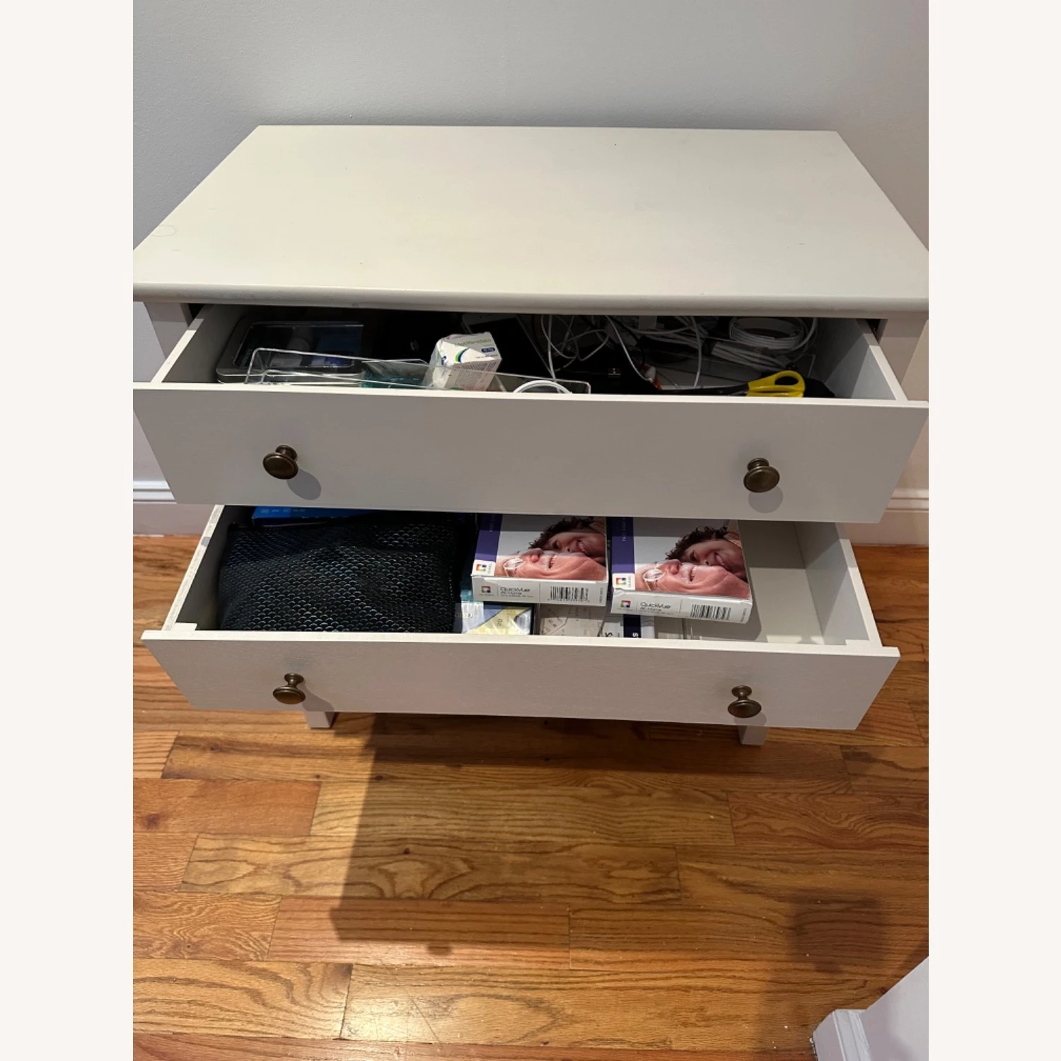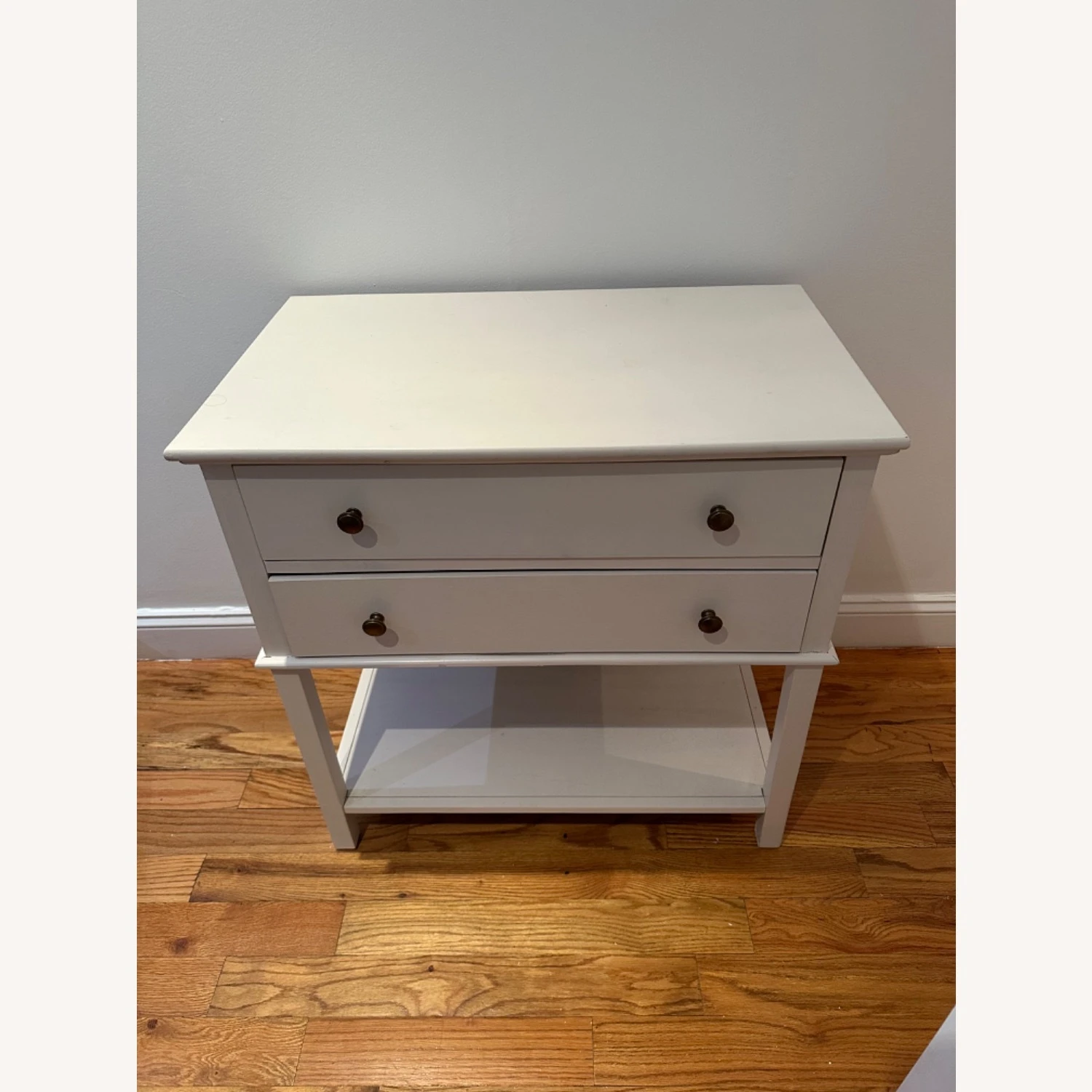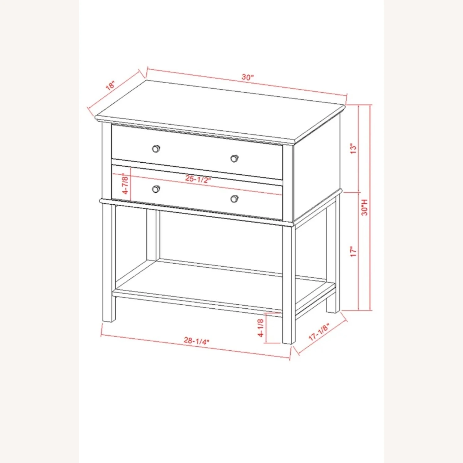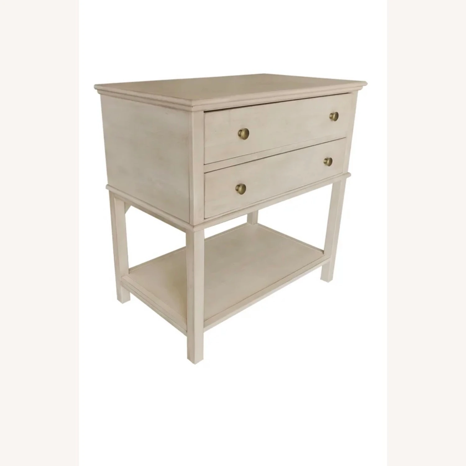 Seller’s Notes: This large end table provides plenty of storage space for your bedtime essentials. It’s made from solid and engineered wood in a washed wood cream rustic finish. Two drawers with removable brass-finished hardware provide out-of-sight storage for your chargers, glasses or other nighttime must-haves. An open bottom shelf offers a spot to display decorative objects or to stash storage containers. It measures 30” inch tall and 30” wide, making it ideal next to your bed while offering plenty of tabletop space for lamps and books.