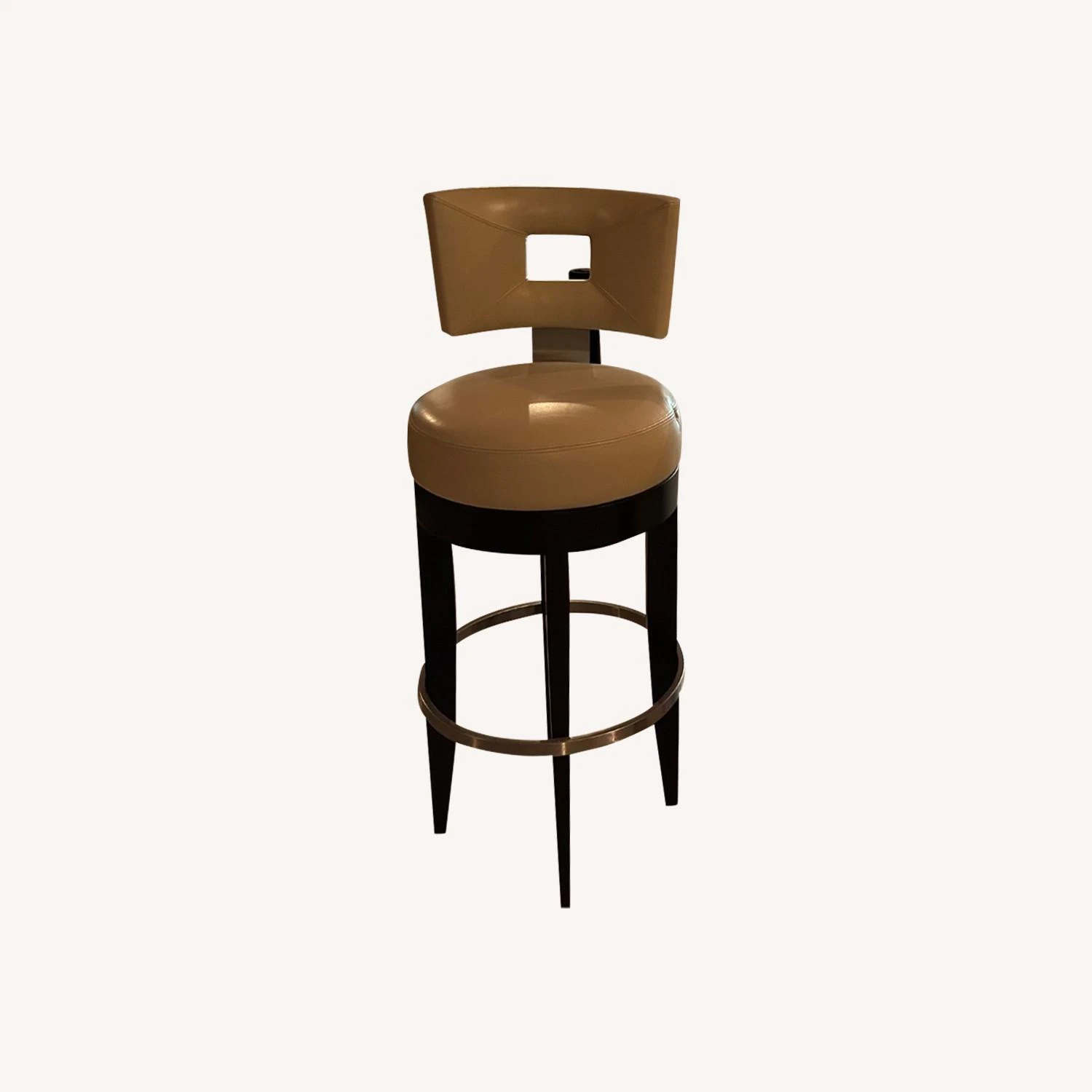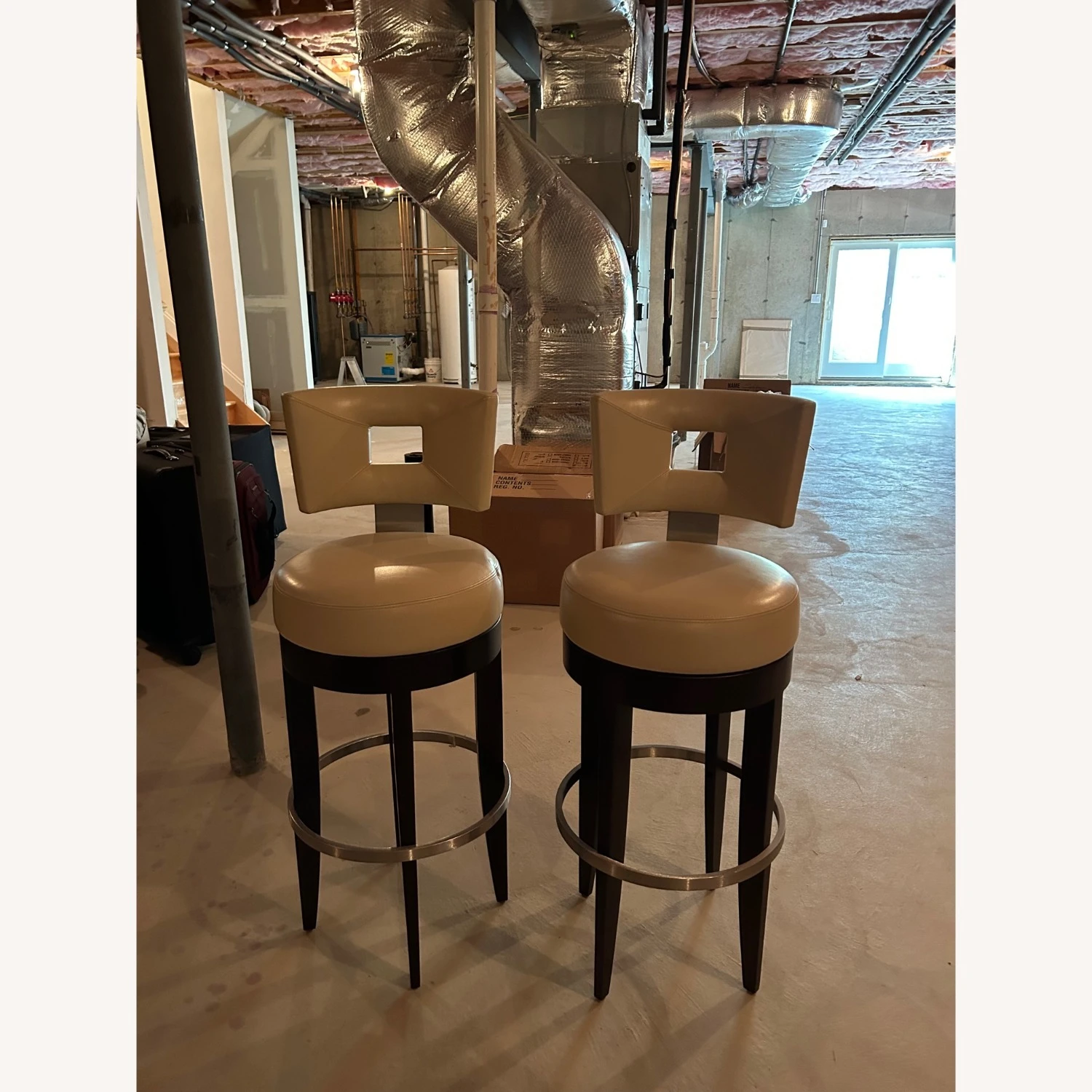 Seller’s Notes: Evanson, Odeon swivel stool, a comfortable, smart & sophisticated design. Solid Maple frame walnut stain, stainless steel hardware. Bar height. Used in weekend pied a tier.