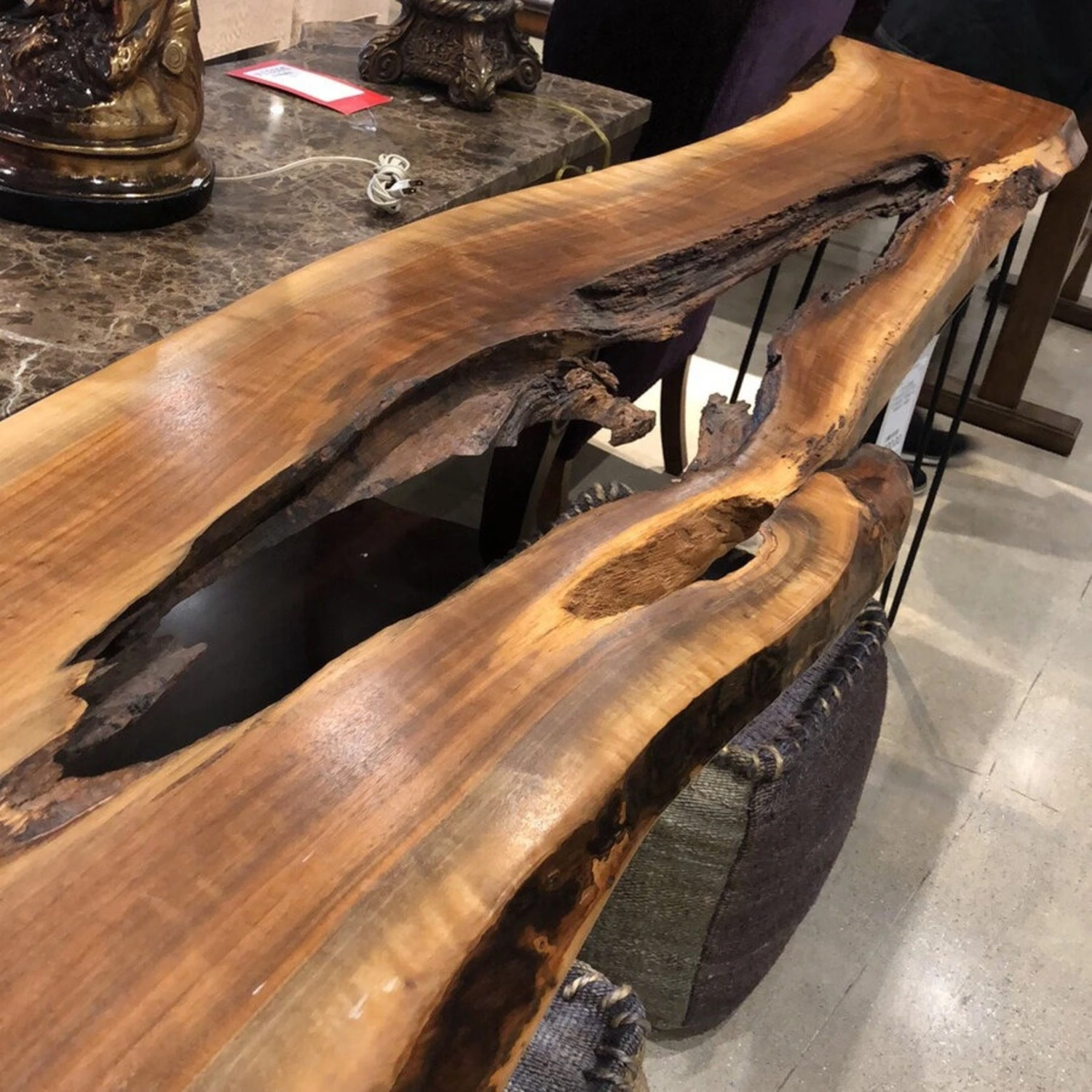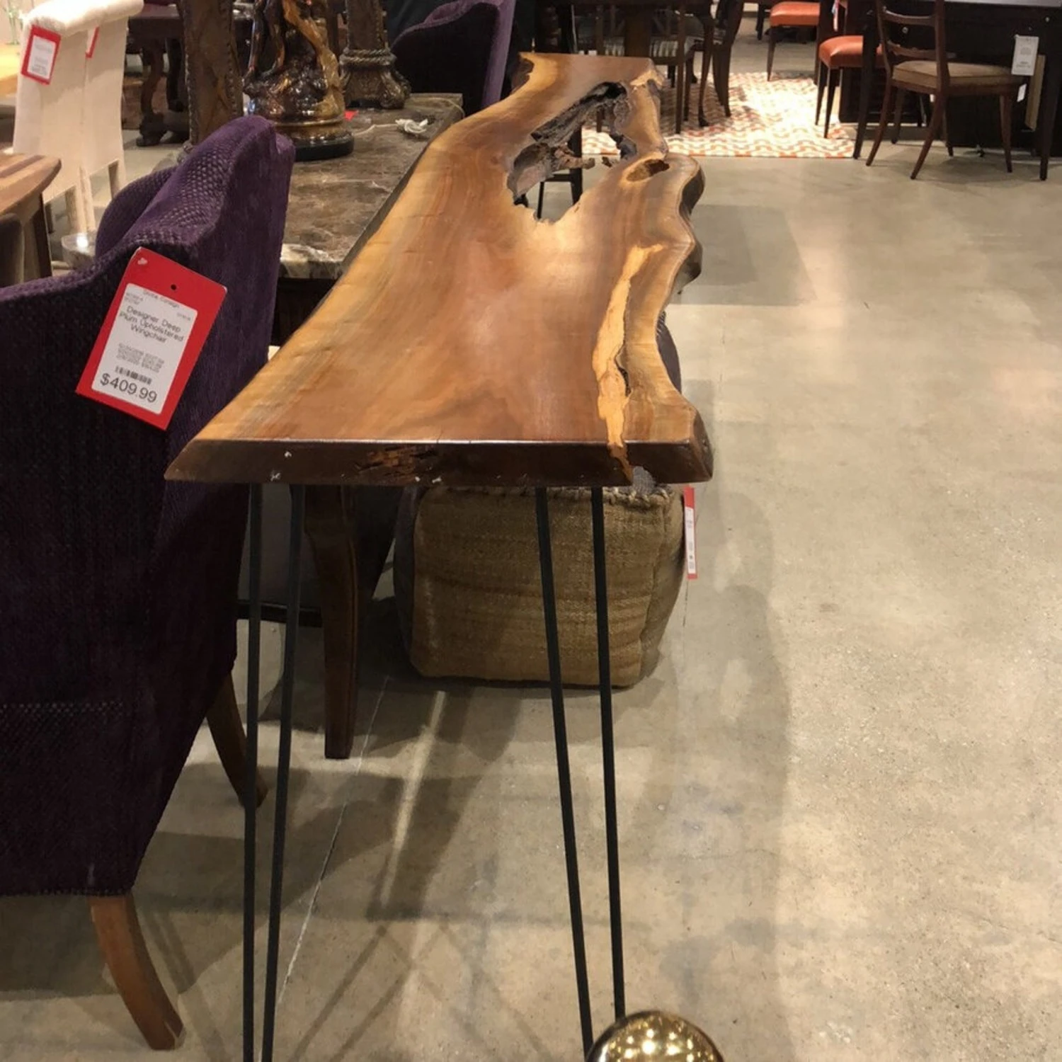 Seller’s Notes: This beautiful table has a live edge on one side and a flat edge on the other so that it can fit up against a wall or sofa. This particular table is made from Black Walnut.