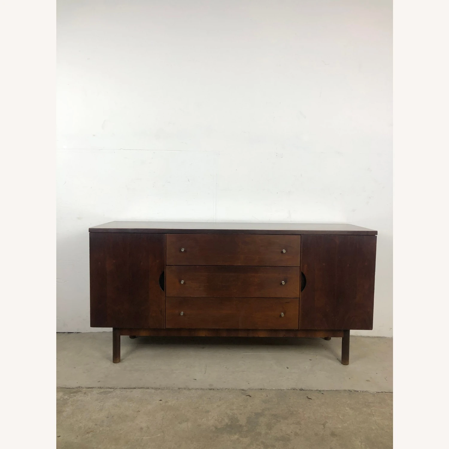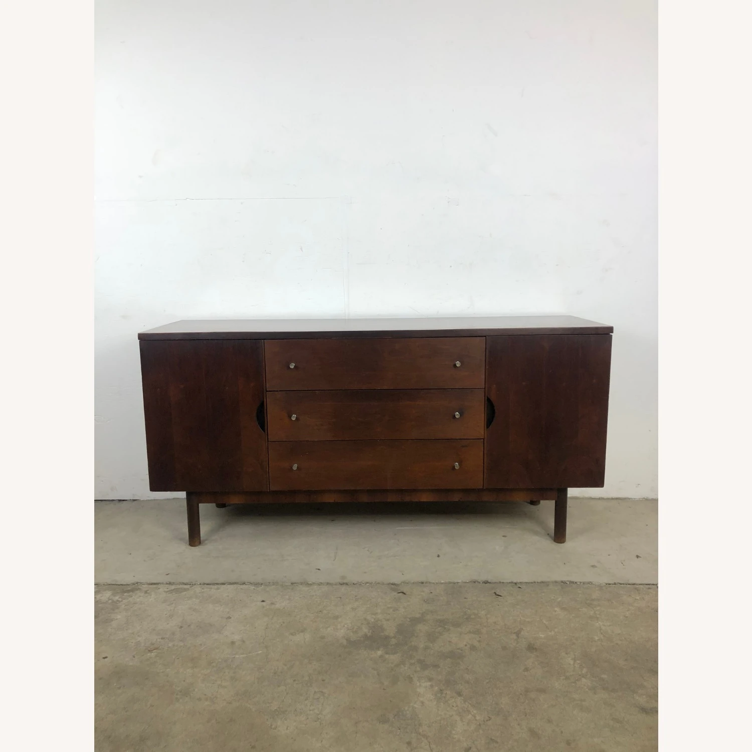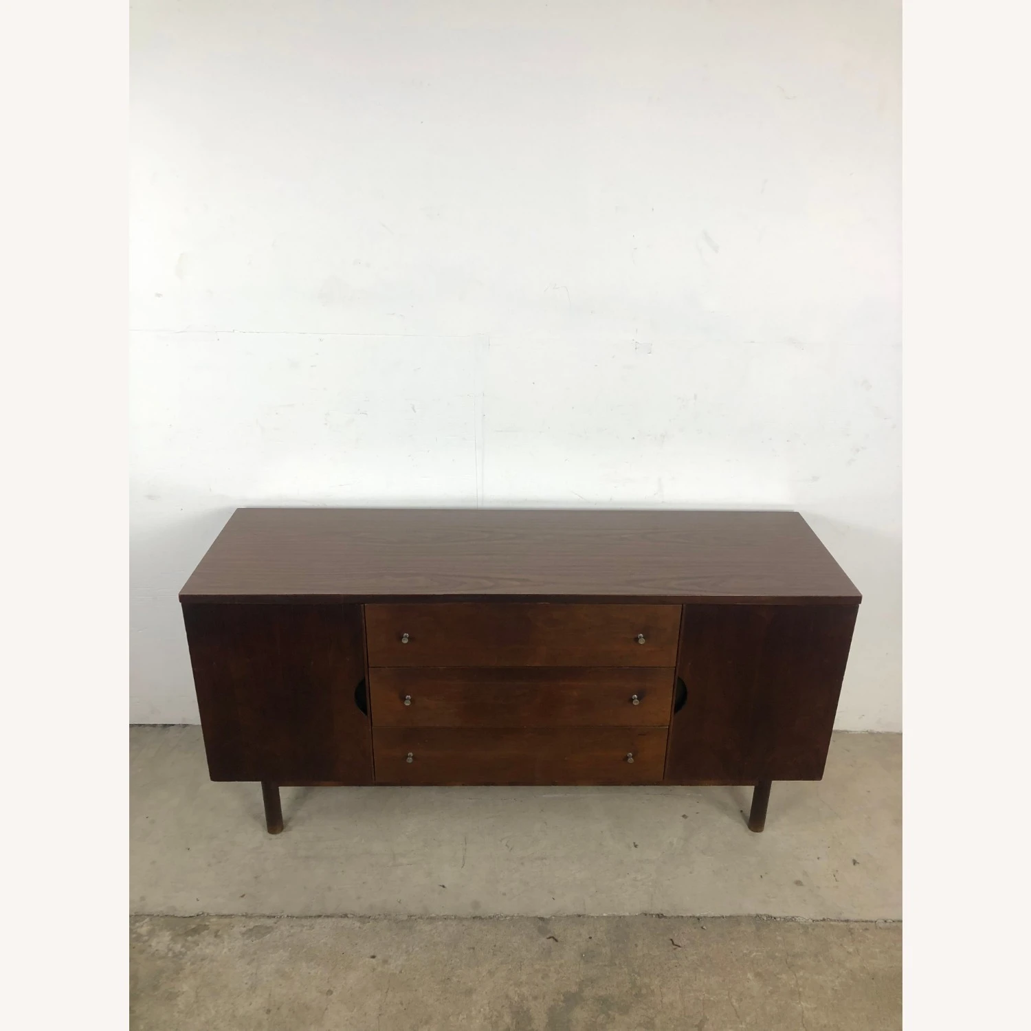 Seller’s Notes: This mid century modern credenza by Stanley Furniture features hardwood construction, original walnut finish, three dovetailed drawers with chrome hardware, and two cabinets with concealed storage.