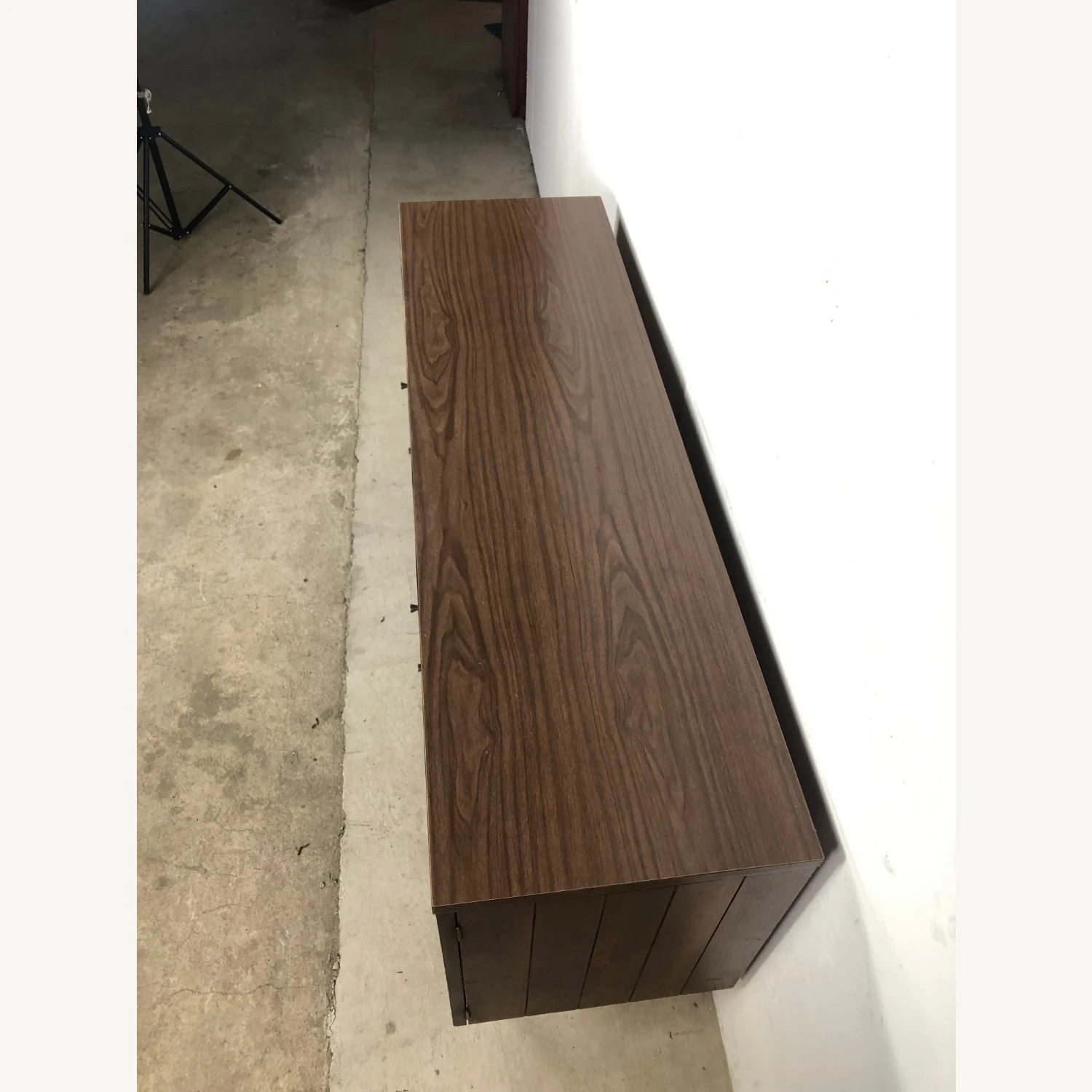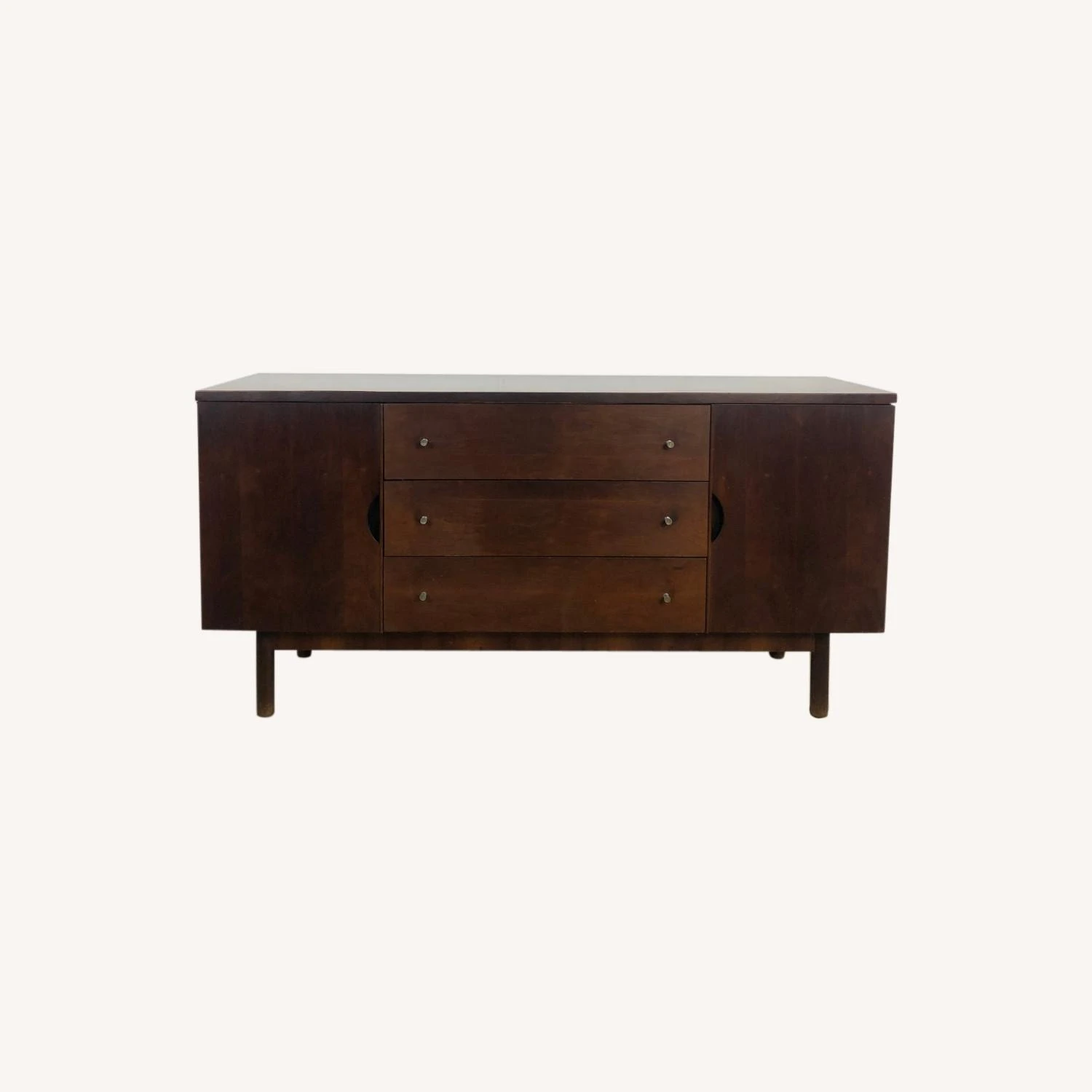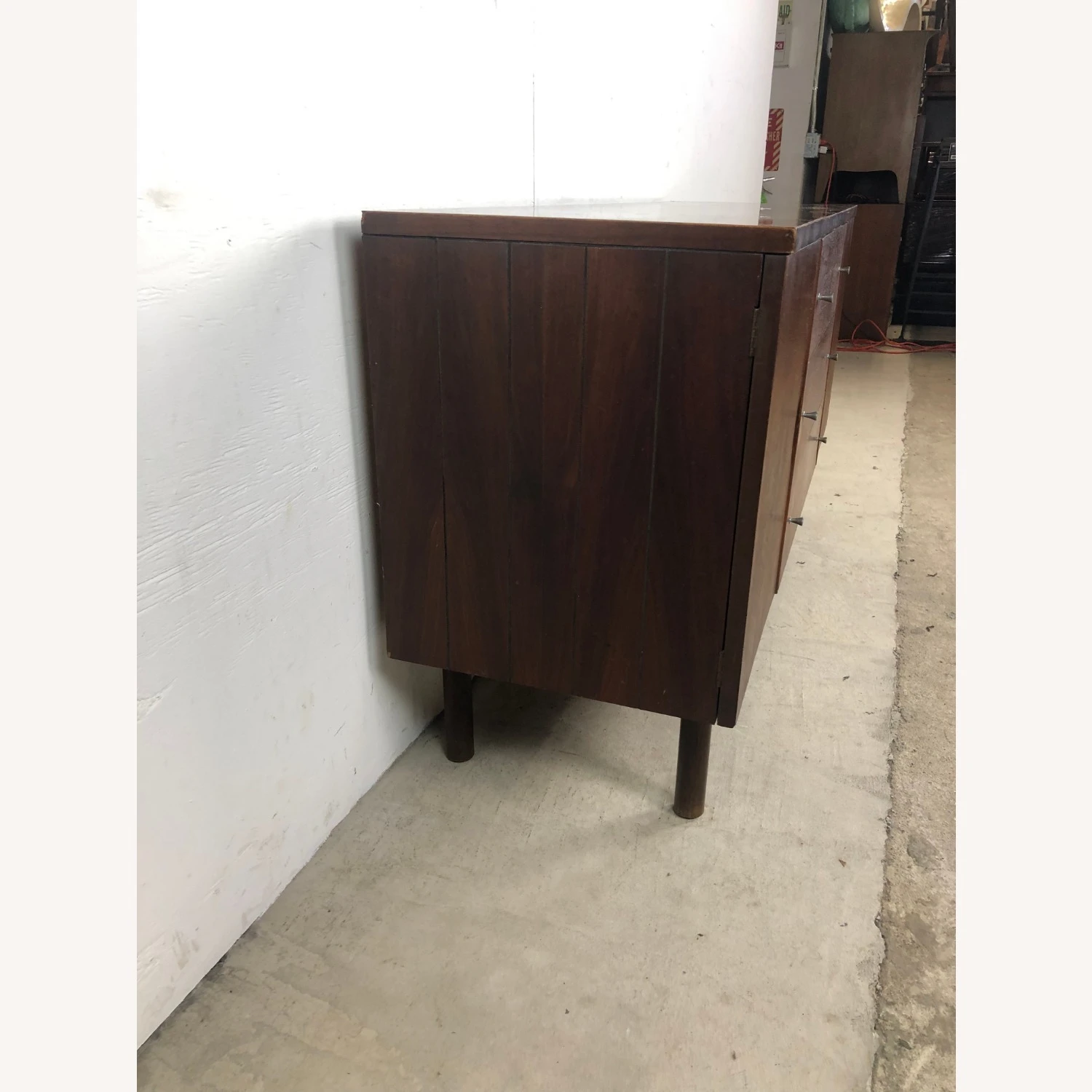 Seller’s Notes: This mid century modern credenza by Stanley Furniture features hardwood construction, original walnut finish, three dovetailed drawers with chrome hardware, and two cabinets with concealed storage.