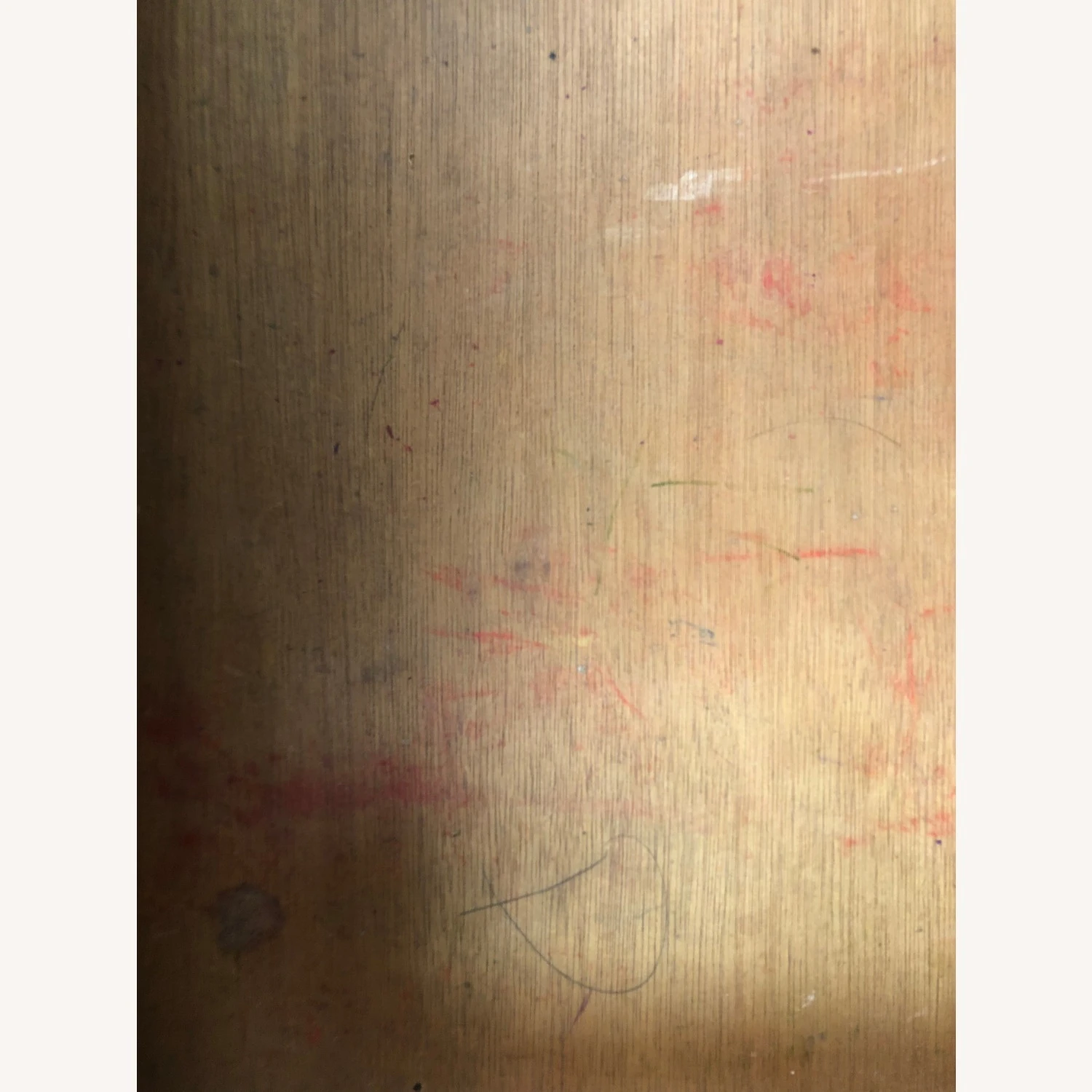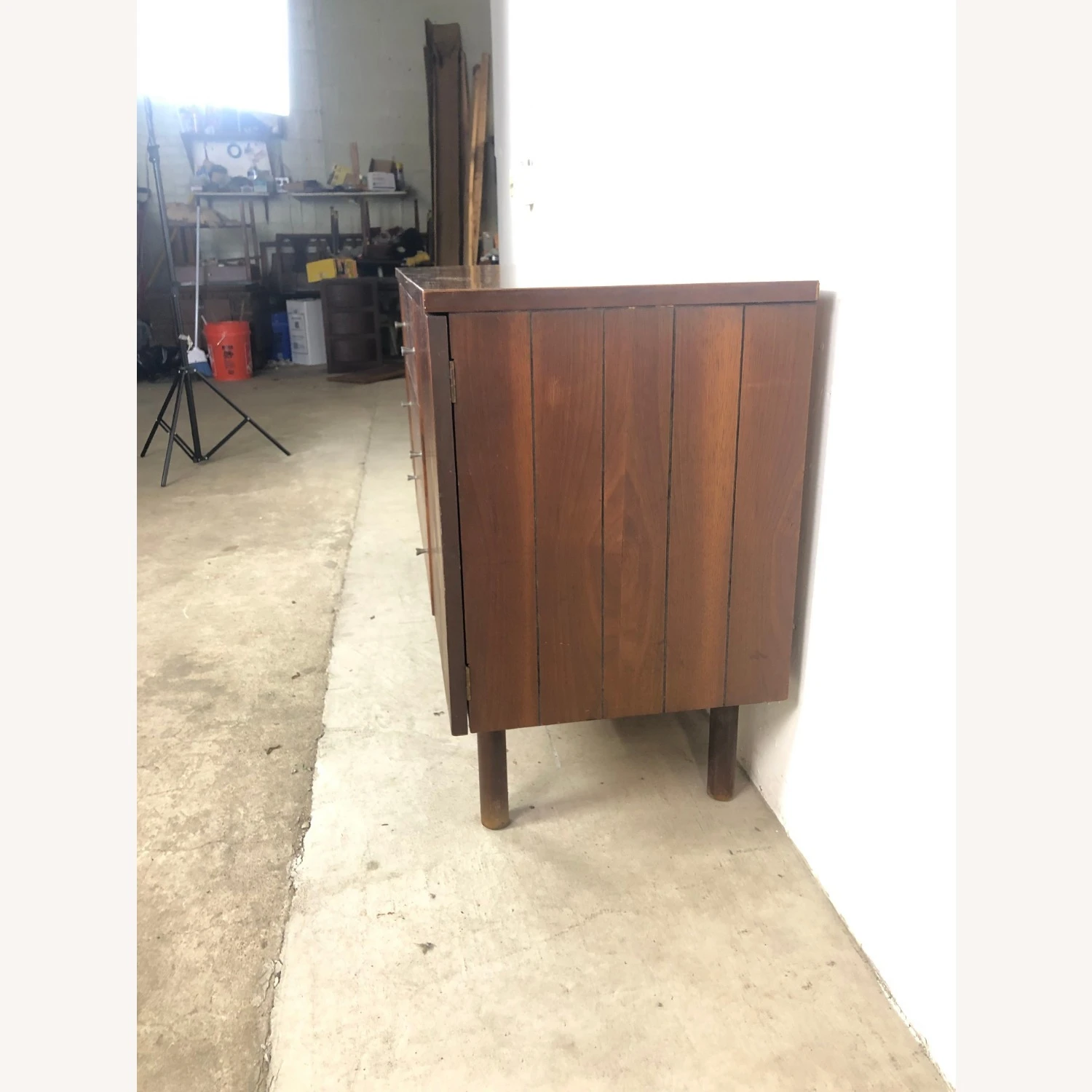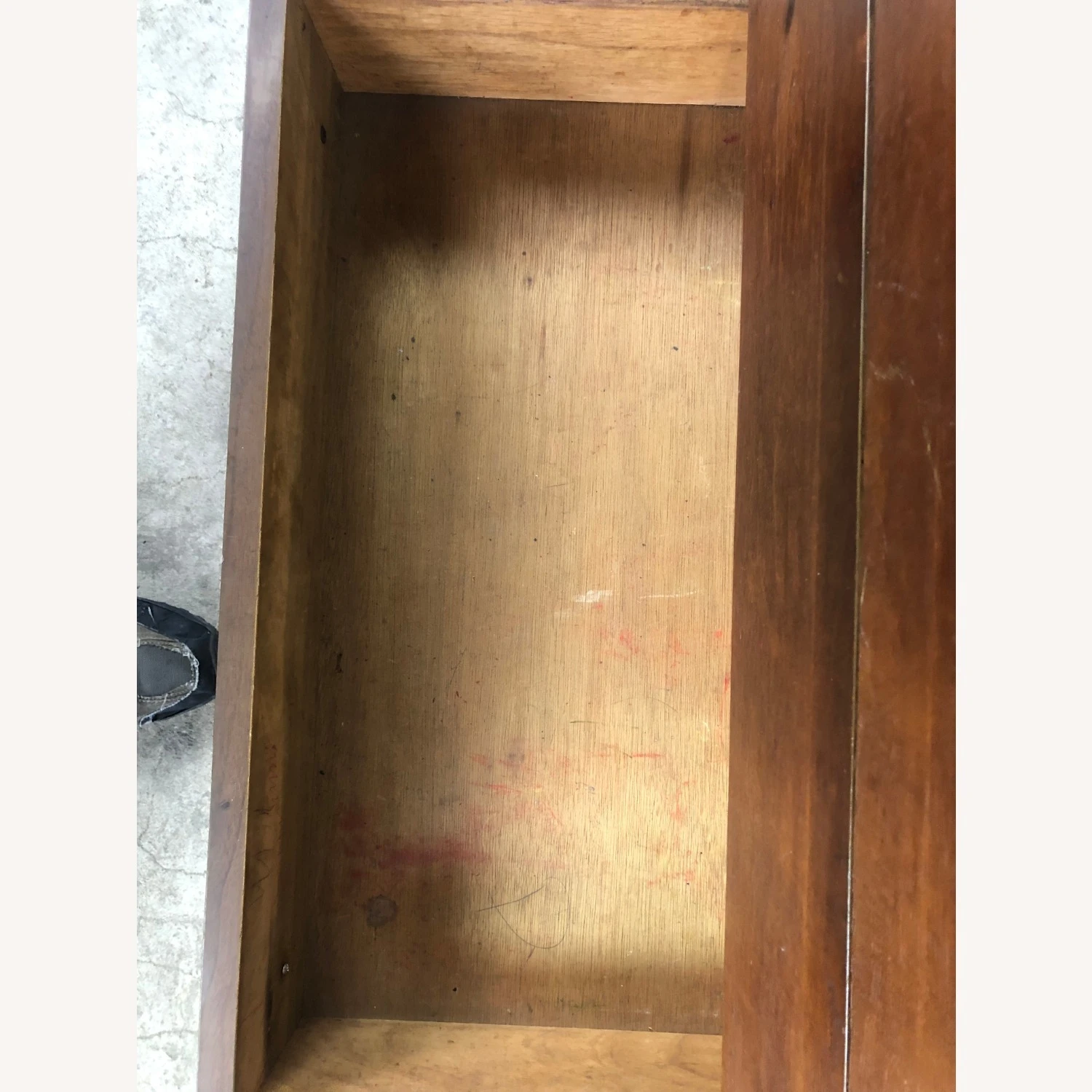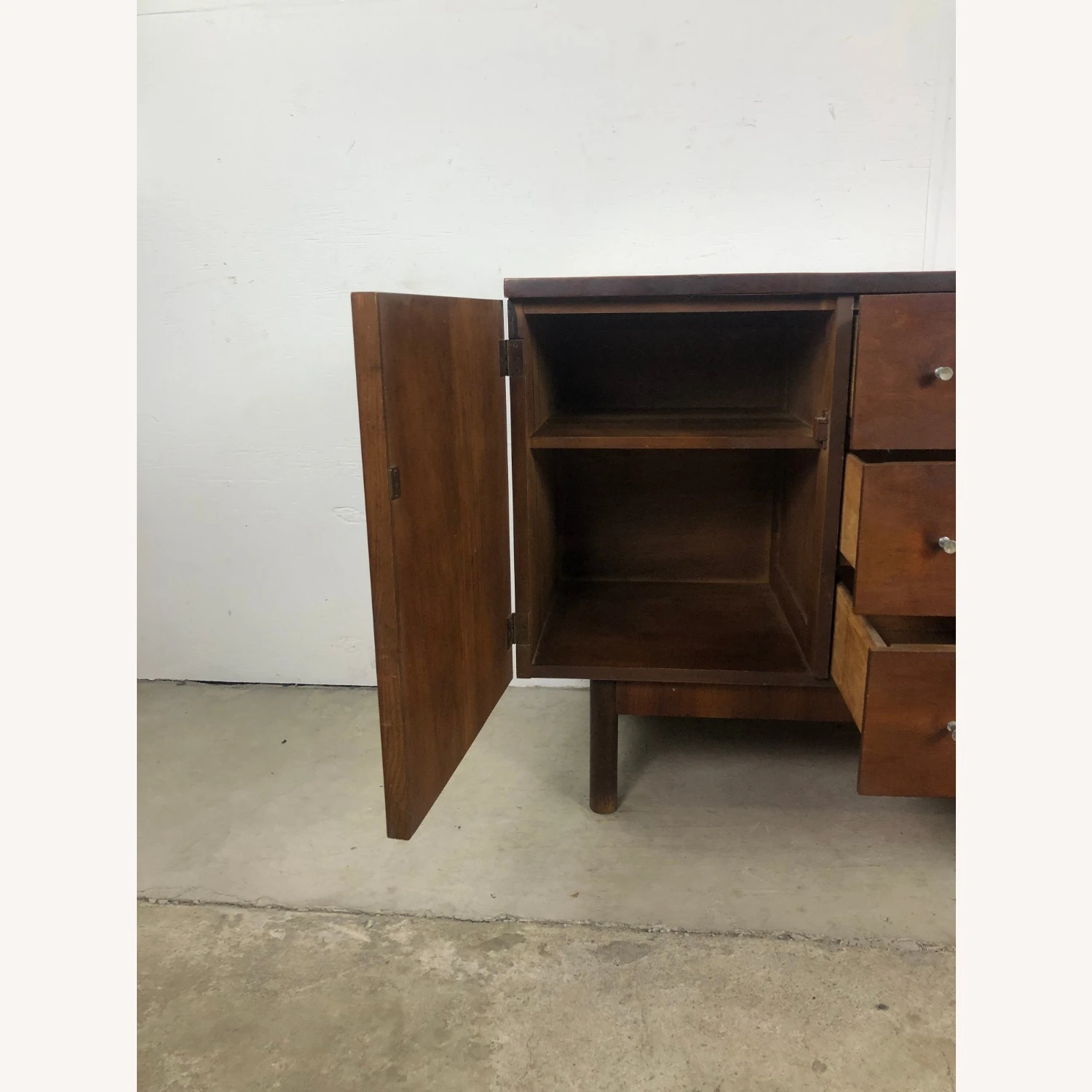 Condition: Original walnut finish has some fading on the drawer faces and doors (see photos). There are small scuffs, veneer chips, slight scratches, edge dings, and kick marks on the legs (see photos). Interior marks in the drawers (see photos). Very sturdy piece with lots of life left as-is. 8/10