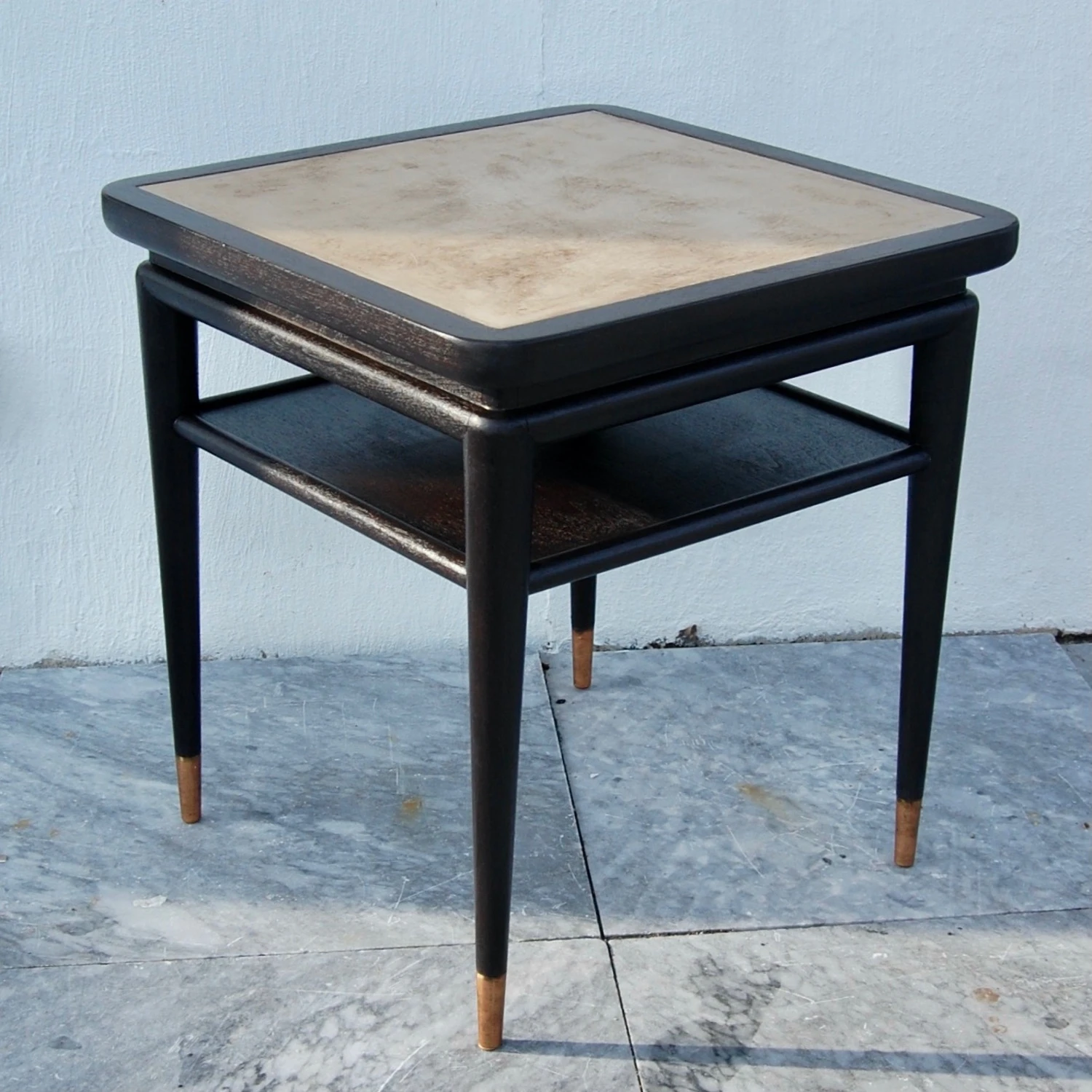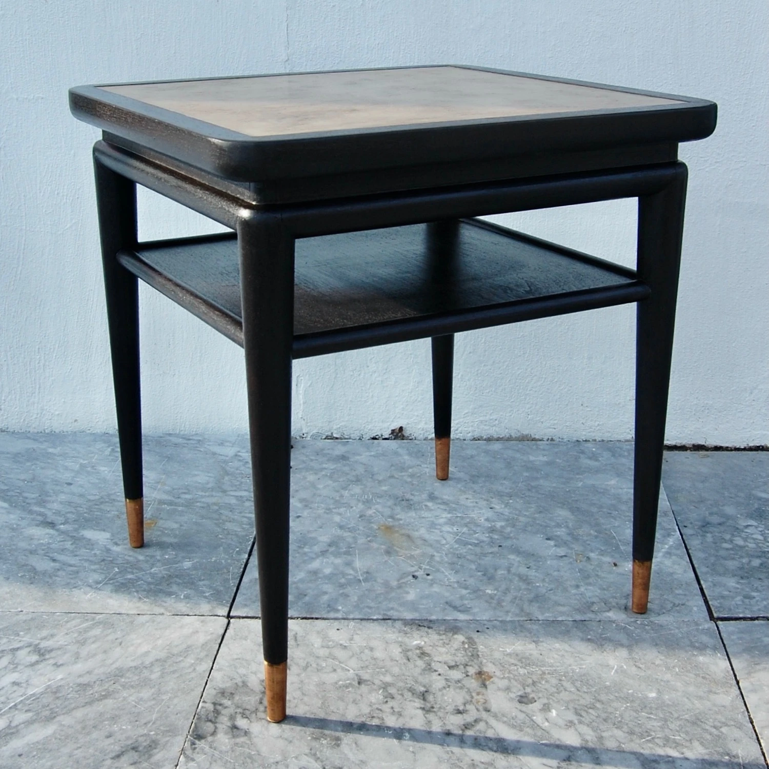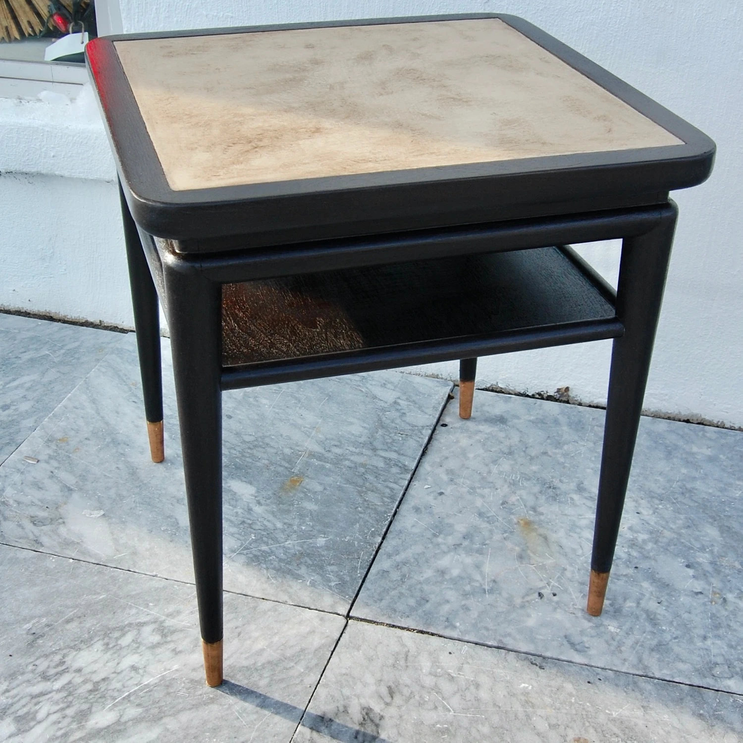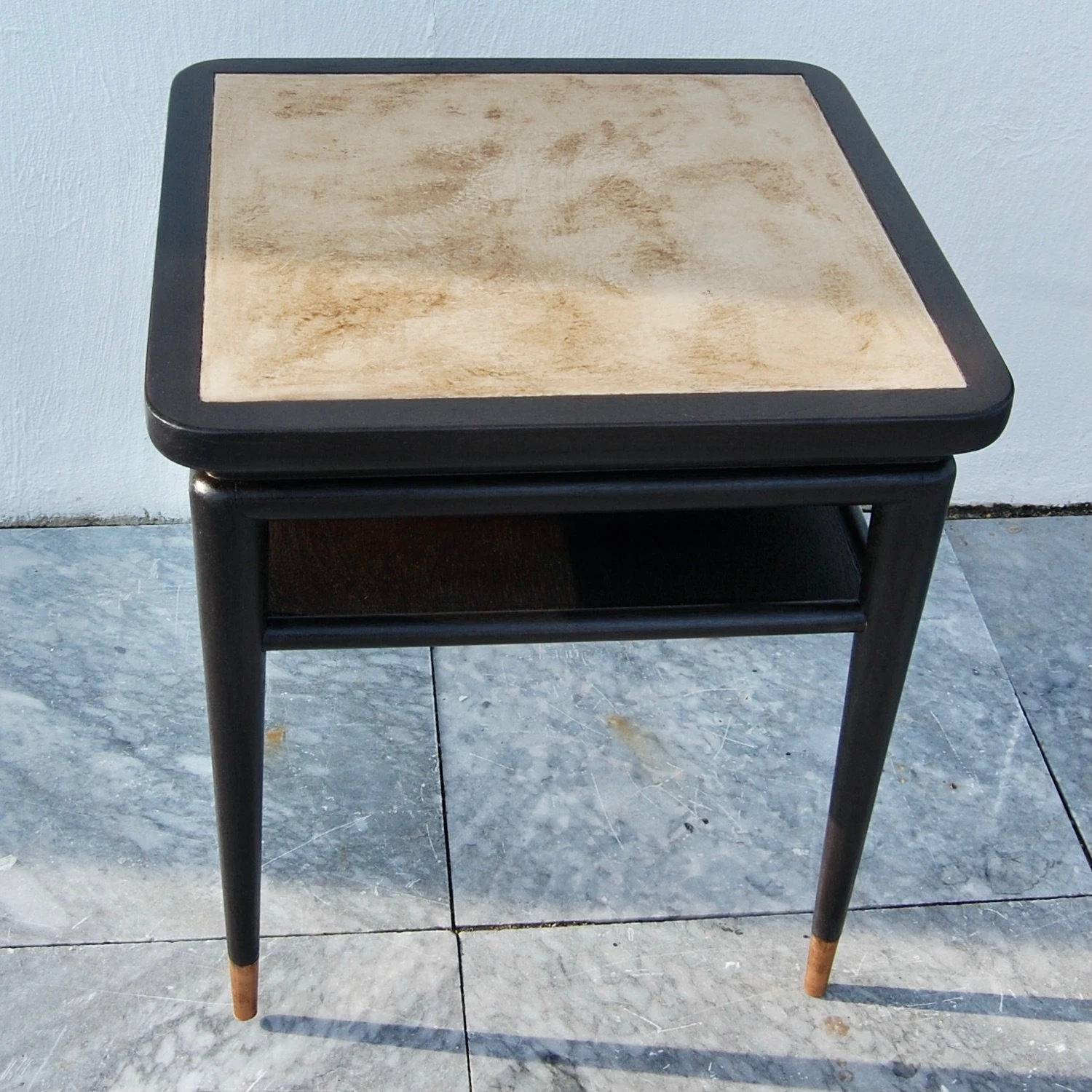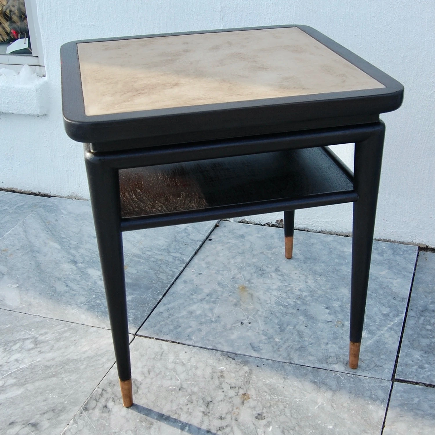 Seller’s Notes: Sculptural mid-century end tables with legs that taper to copper colored metal feet. The table top is a synthetic material that has been refinished with a random pattern utilizing a paint and colored wax finish for beautiful effect. the wood table frame has been retained in a deep warm “espresso” color. tables feature a shelf below the main table top. The edging of the table top has a “reveal” that wraps around the perimeter. These pieces are in very good vintage condition.