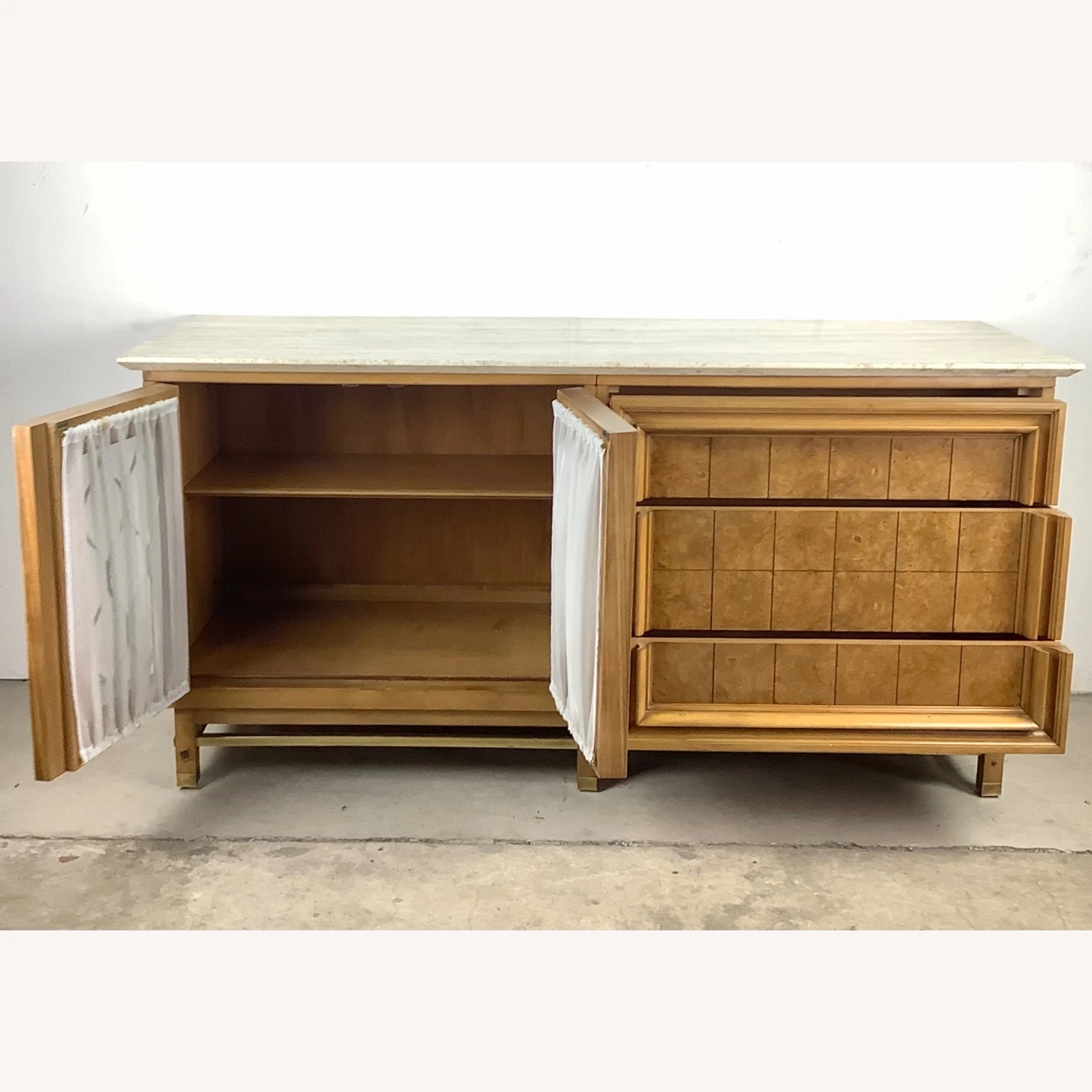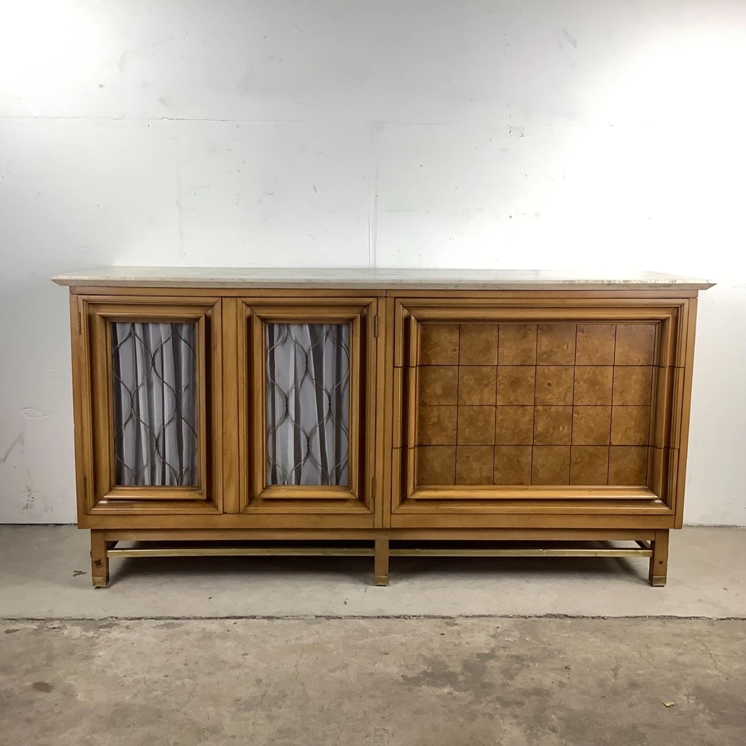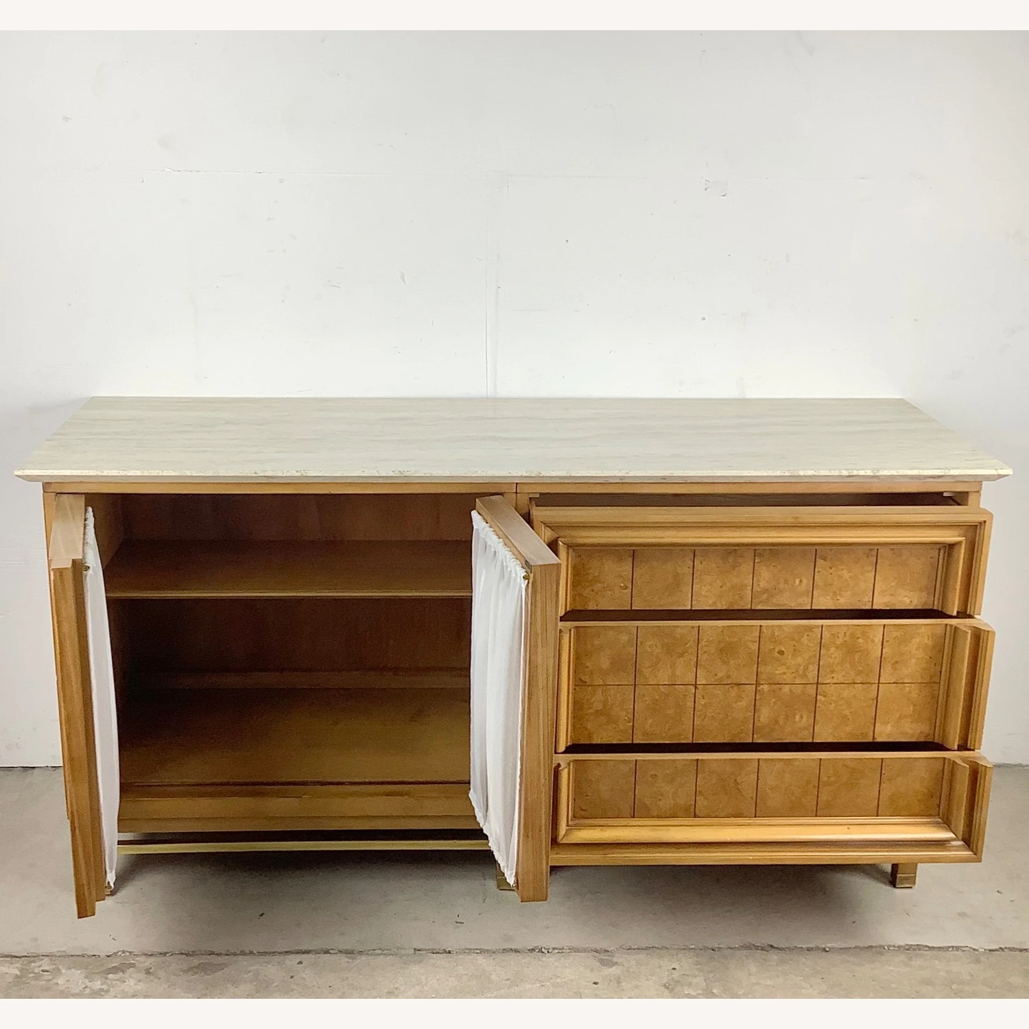 Seller’s Notes: This unique mid-century modern travertine top credenza features a spacious mix of three drawers and a shelved cabinet. The marble like travertine top wonderfully compliments the natural wood finish as well as the brass detail trim. Sturdy vintage construction mixed with unique design makes for a striking centerpiece in any setting- manufactured by JJ Metz- matching set of eight dining chairs also available- message seller for information.