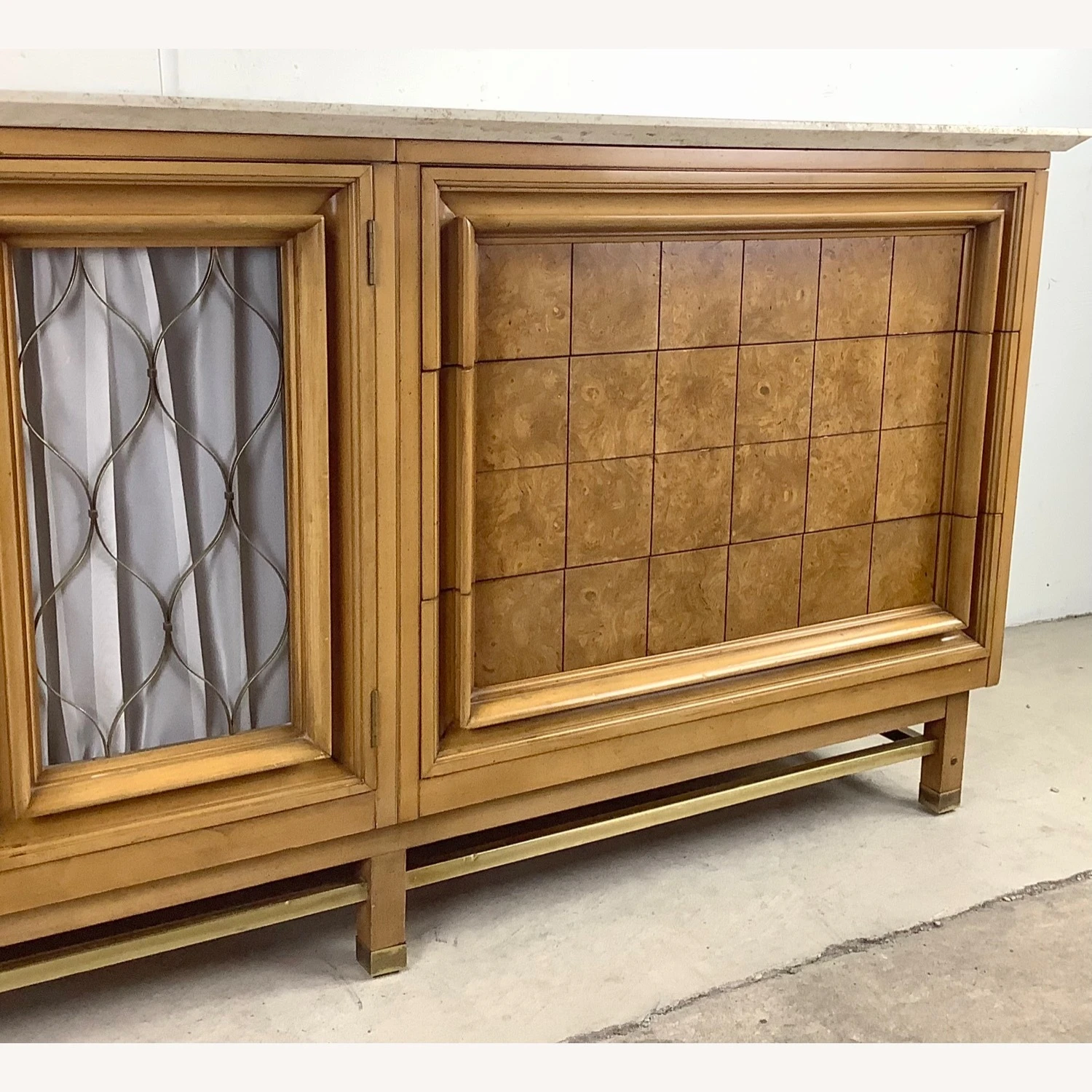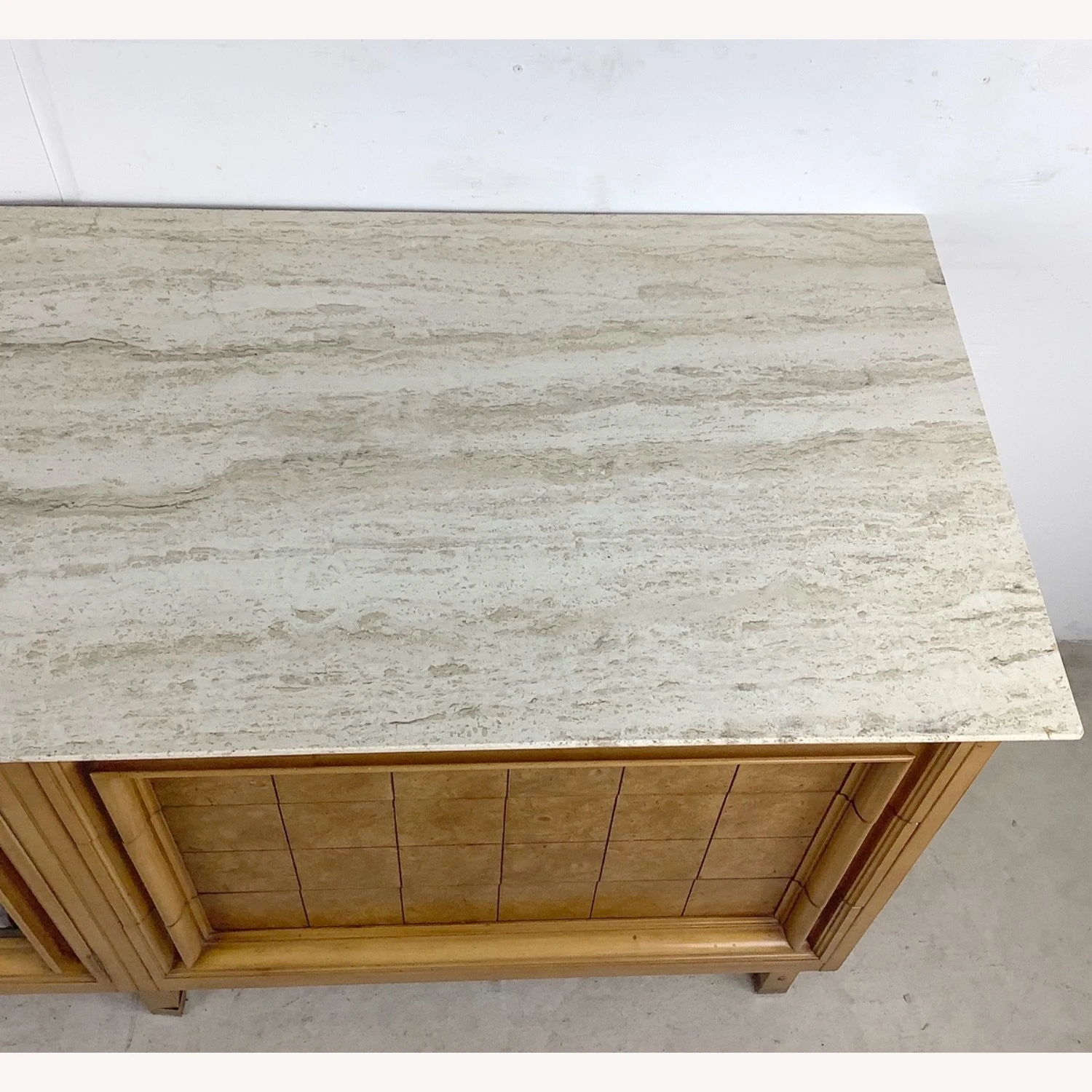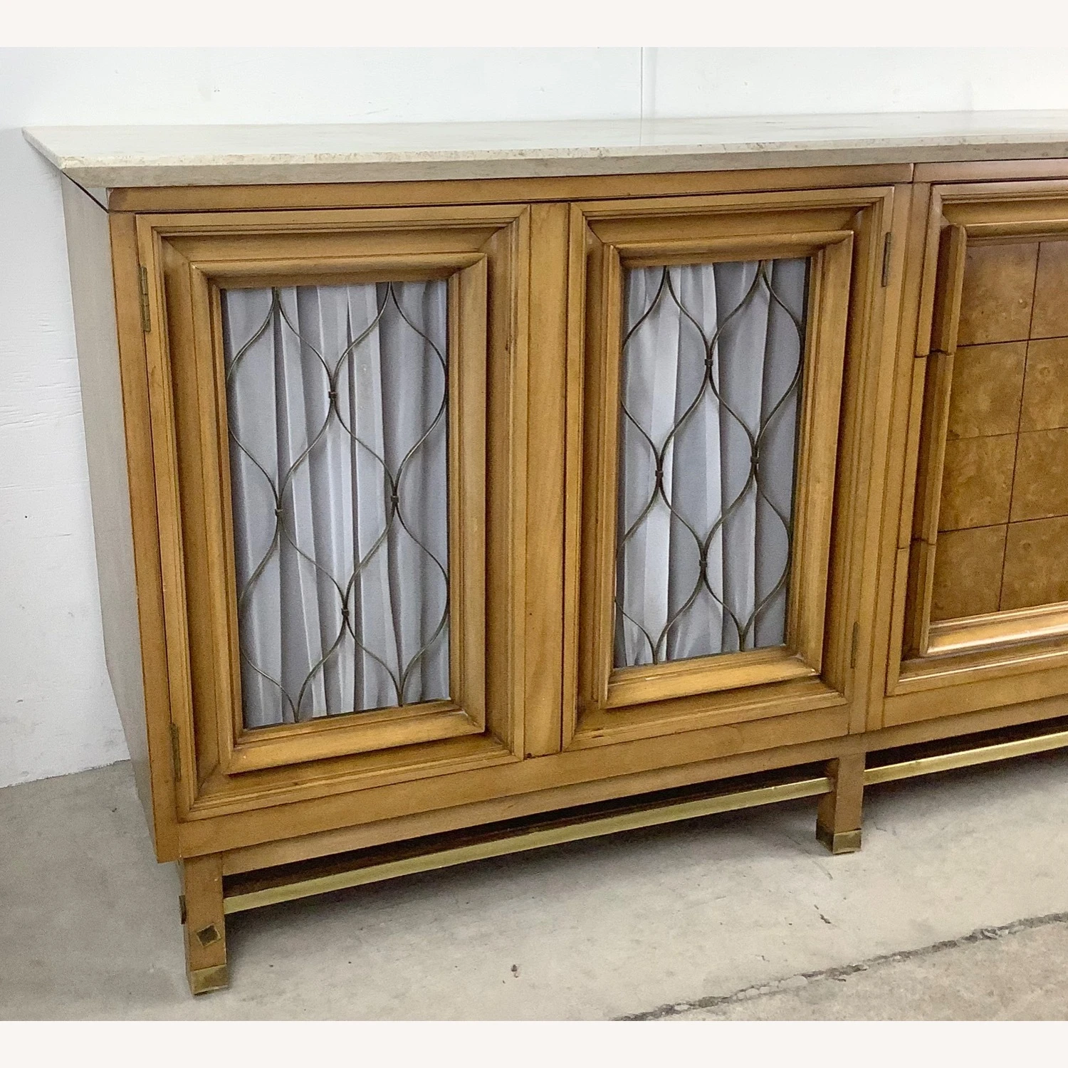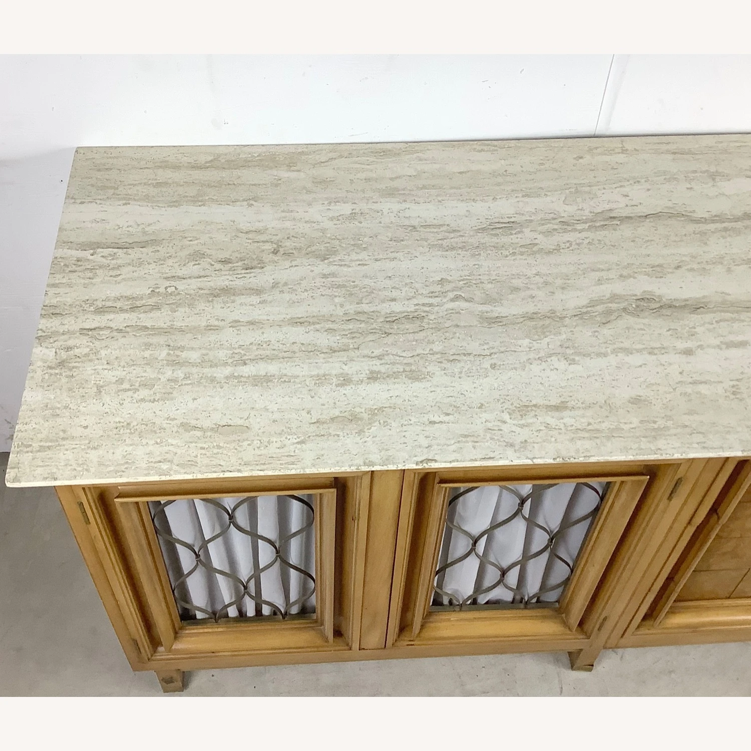 Seller’s Notes: This unique mid-century modern travertine top credenza features a spacious mix of three drawers and a shelved cabinet. The marble like travertine top wonderfully compliments the natural wood finish as well as the brass detail trim. Sturdy vintage construction mixed with unique design makes for a striking centerpiece in any setting- manufactured by JJ Metz- matching set of eight dining chairs also available- message seller for information.