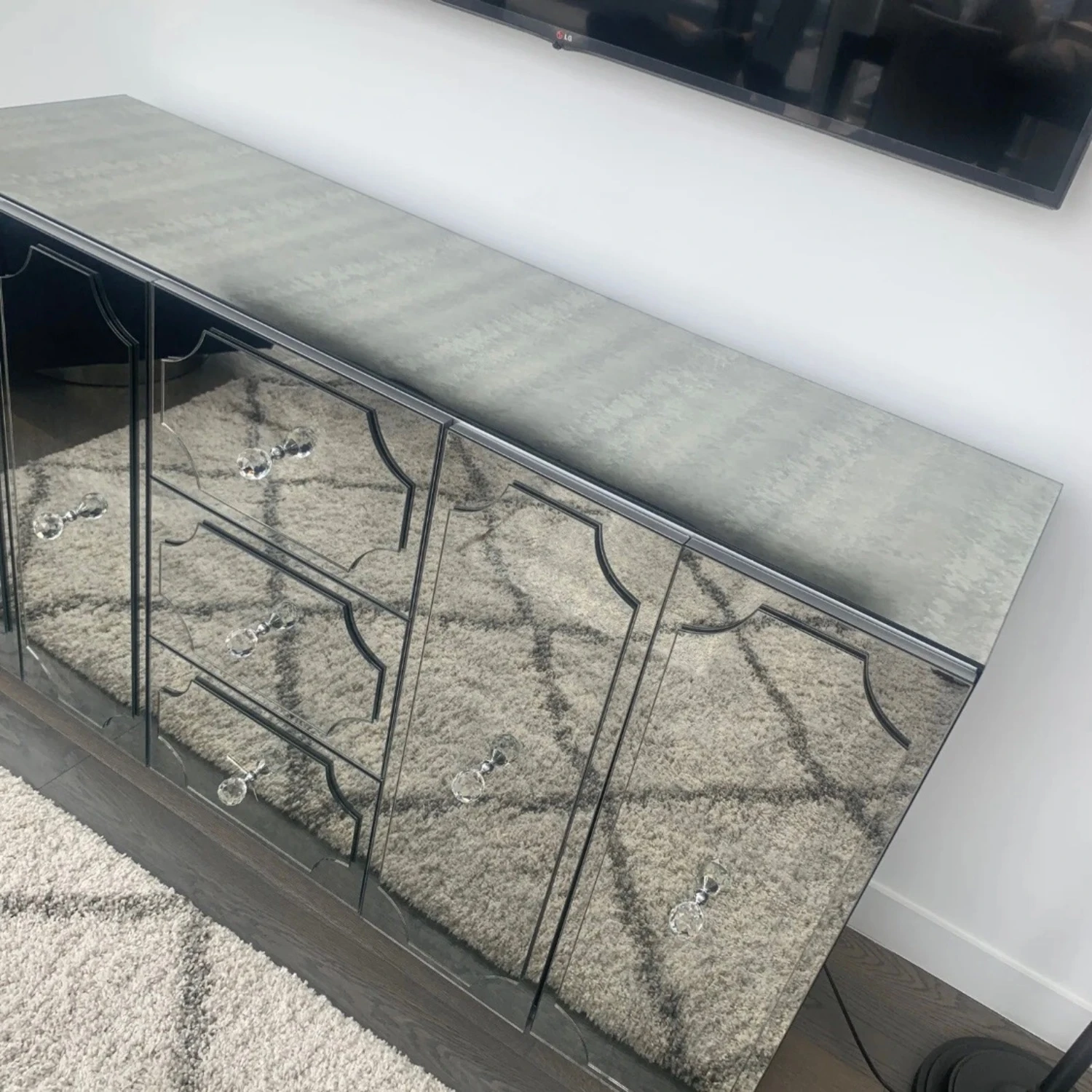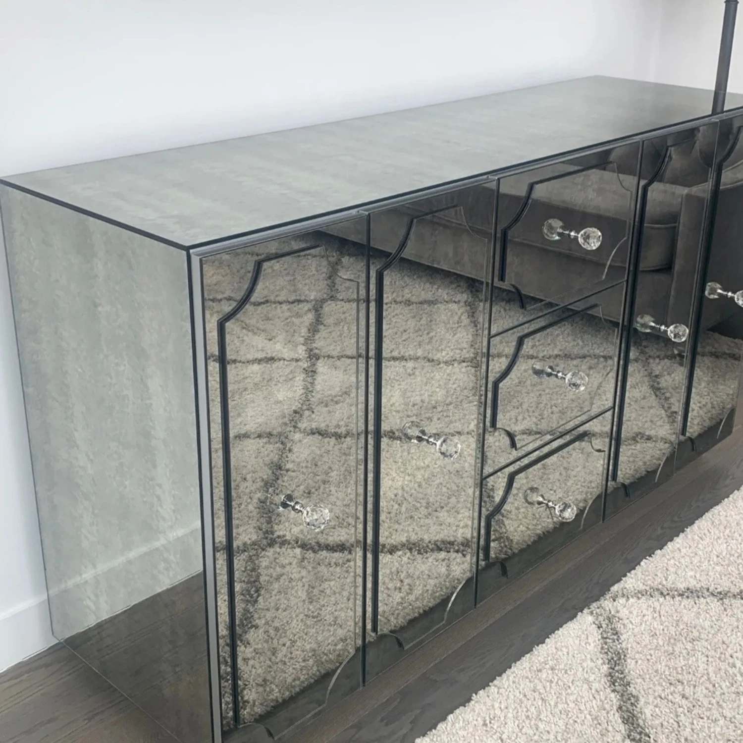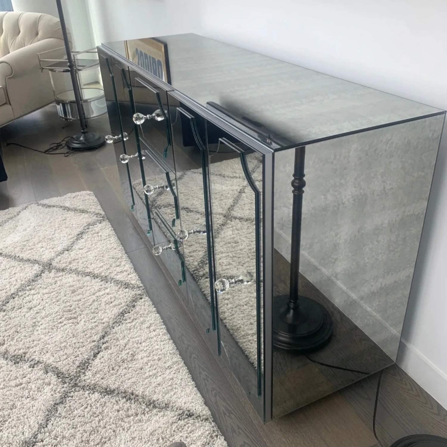 tags: mod shop custom high end designer credenza buffet sideboard storage shelves media cabinet console drawers antique mirror retro chic mirrored glam glamorous feminine pretty vintage chic retro elegant french parisian style modern contemporary transitional traditional luxury decor crystal sparkly handmade hand crafted local nyc manhattan long slim thin narrow