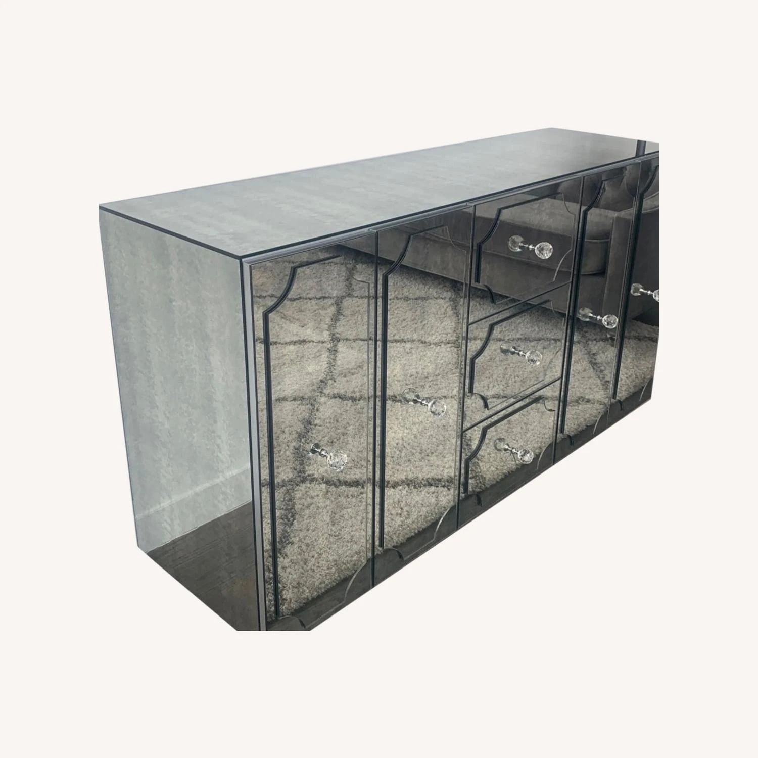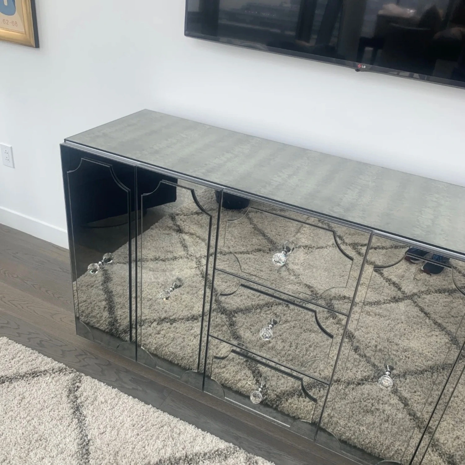 Seller’s Notes: This stunning Antique Mirrored buffet/sideboard/media cabinet was hand crafted at the high end Mod Shop in NYC and cost over $5,000.