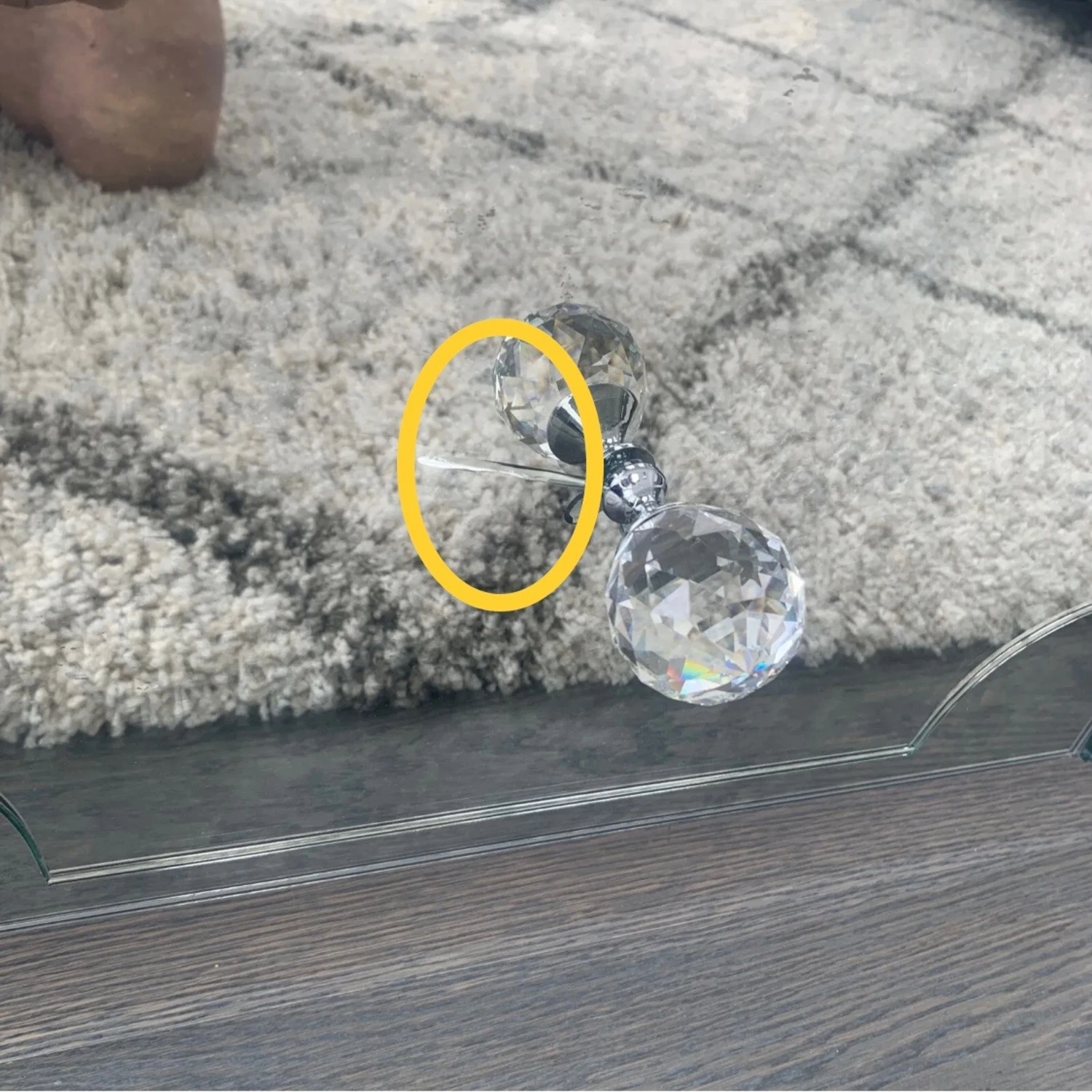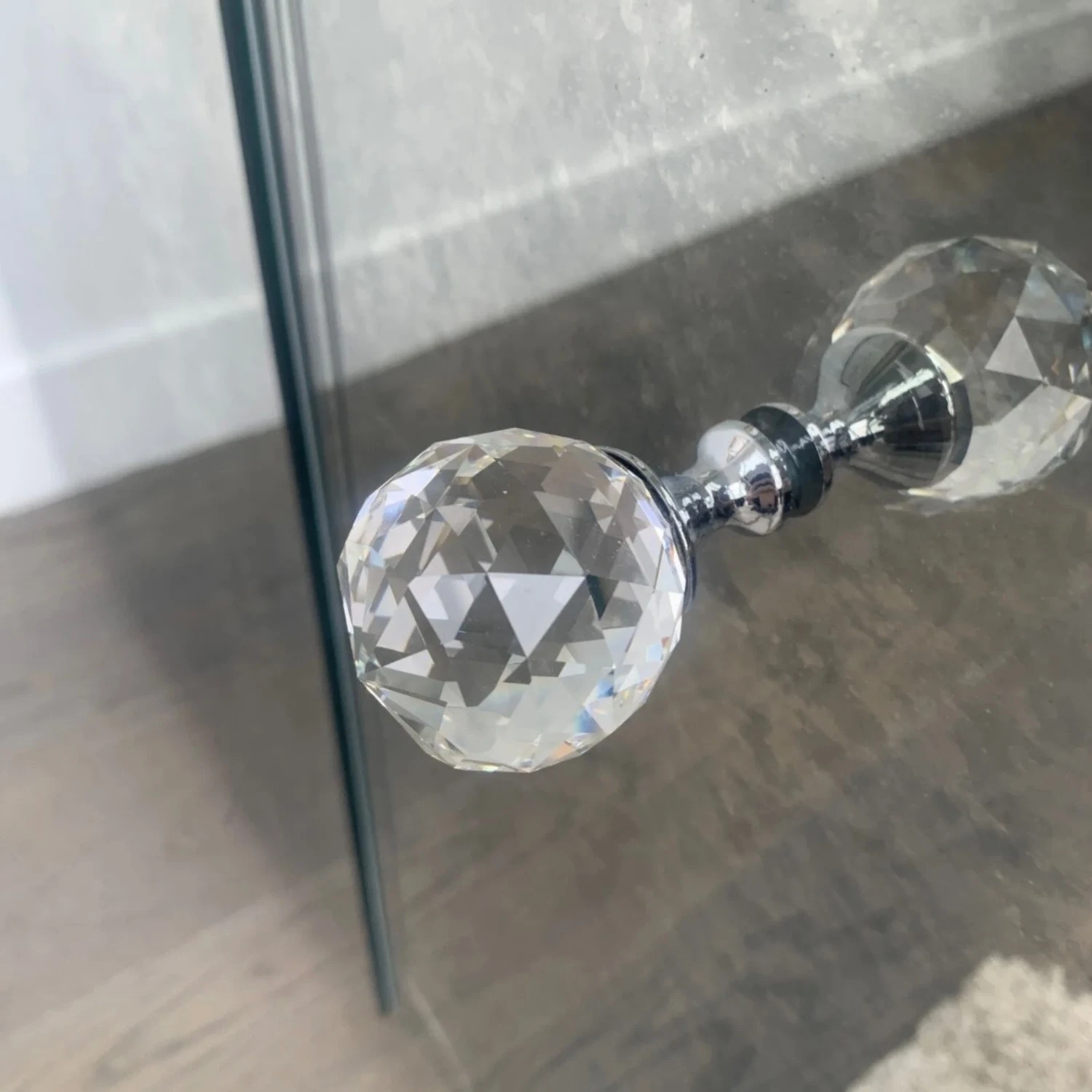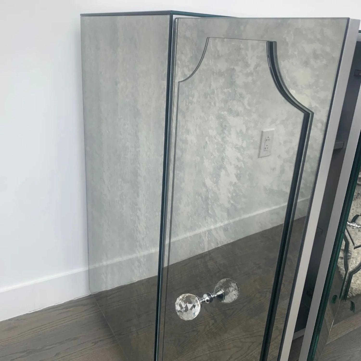 It features an exquisite antique mirror finish, sparkly faceted crystal knob handles, and a raised panel design.