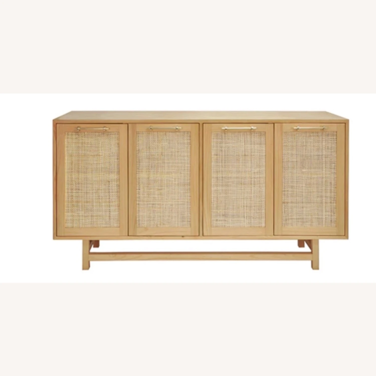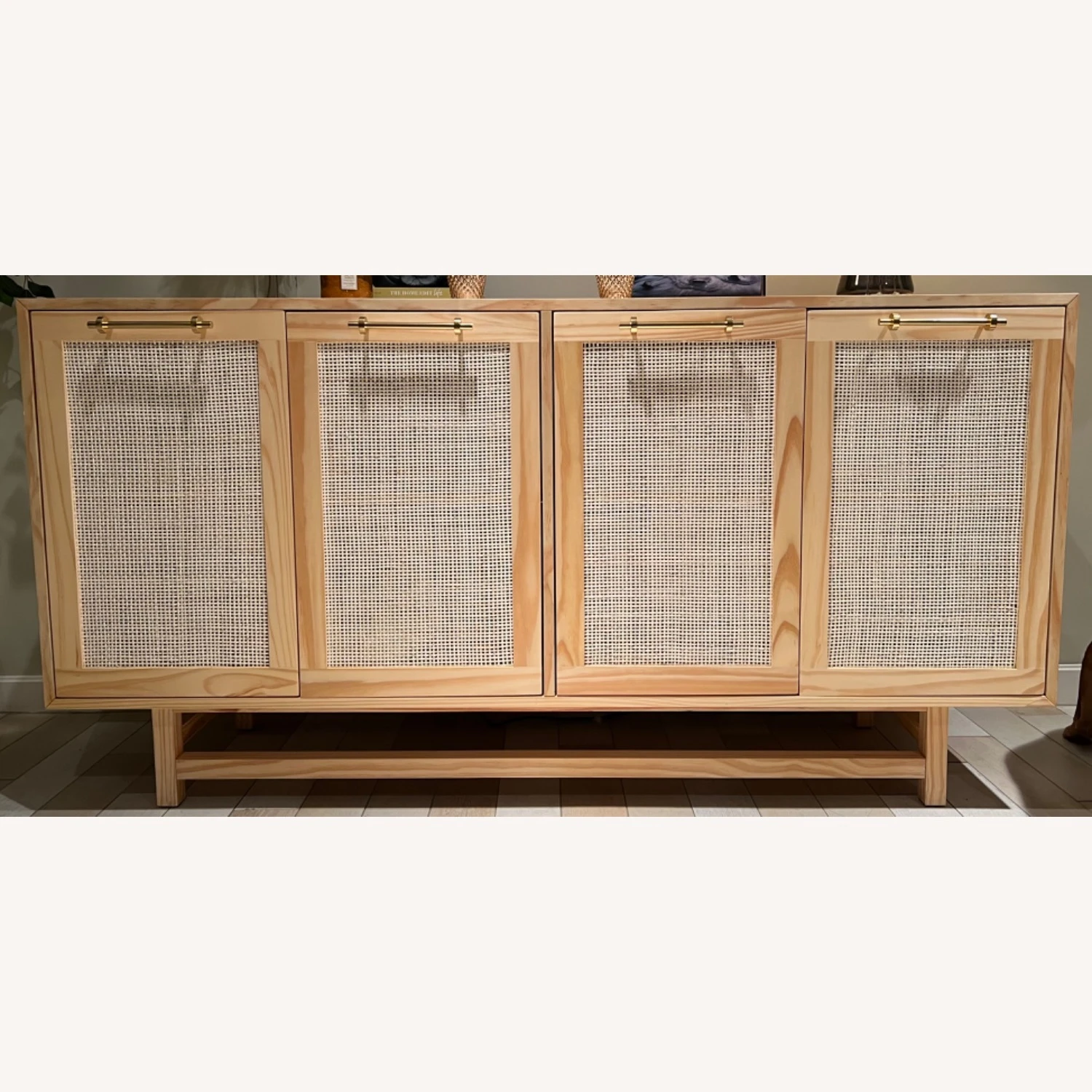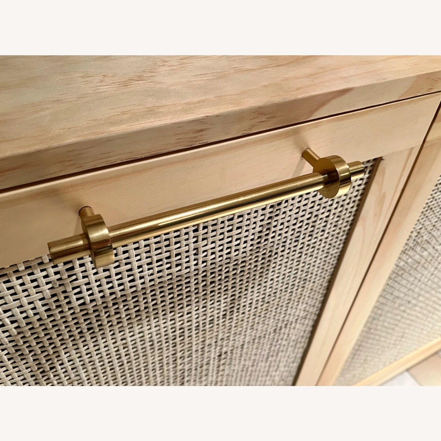 Seller’s Notes: A beautiful piece and like new. Beautiful natural wood with woven paneled cabinets and brass hardware. Two years old and love it, but it wonβt fit in our new condo.