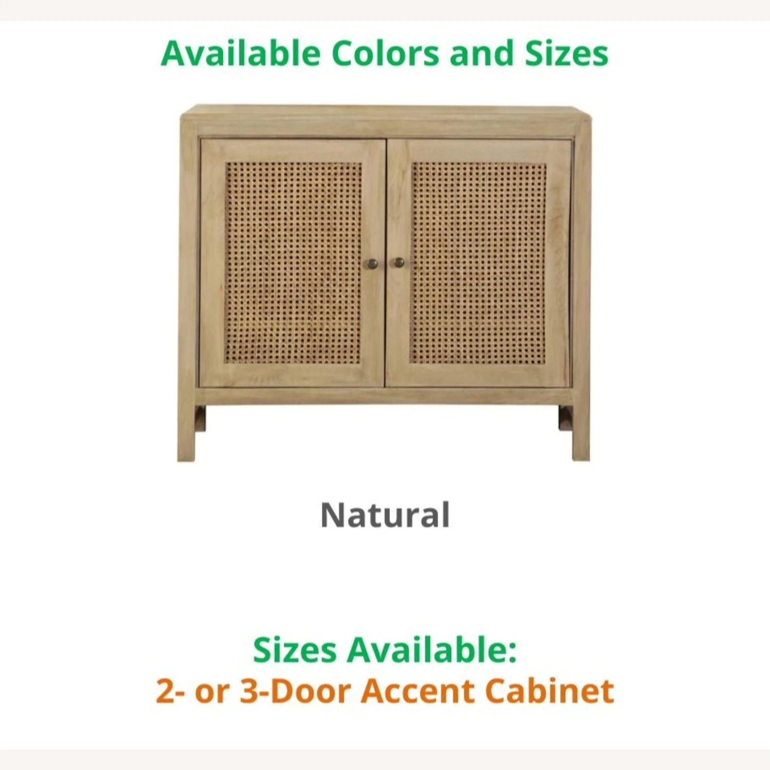 This model comes in these NATURAL, and these sizes: 2- OR 3-DOOR ACCENT CABINET. If you are interested in a color/size other than that of this listing, and if the quantity you wish to purchase is greater than what is listed here, please message us for availability.