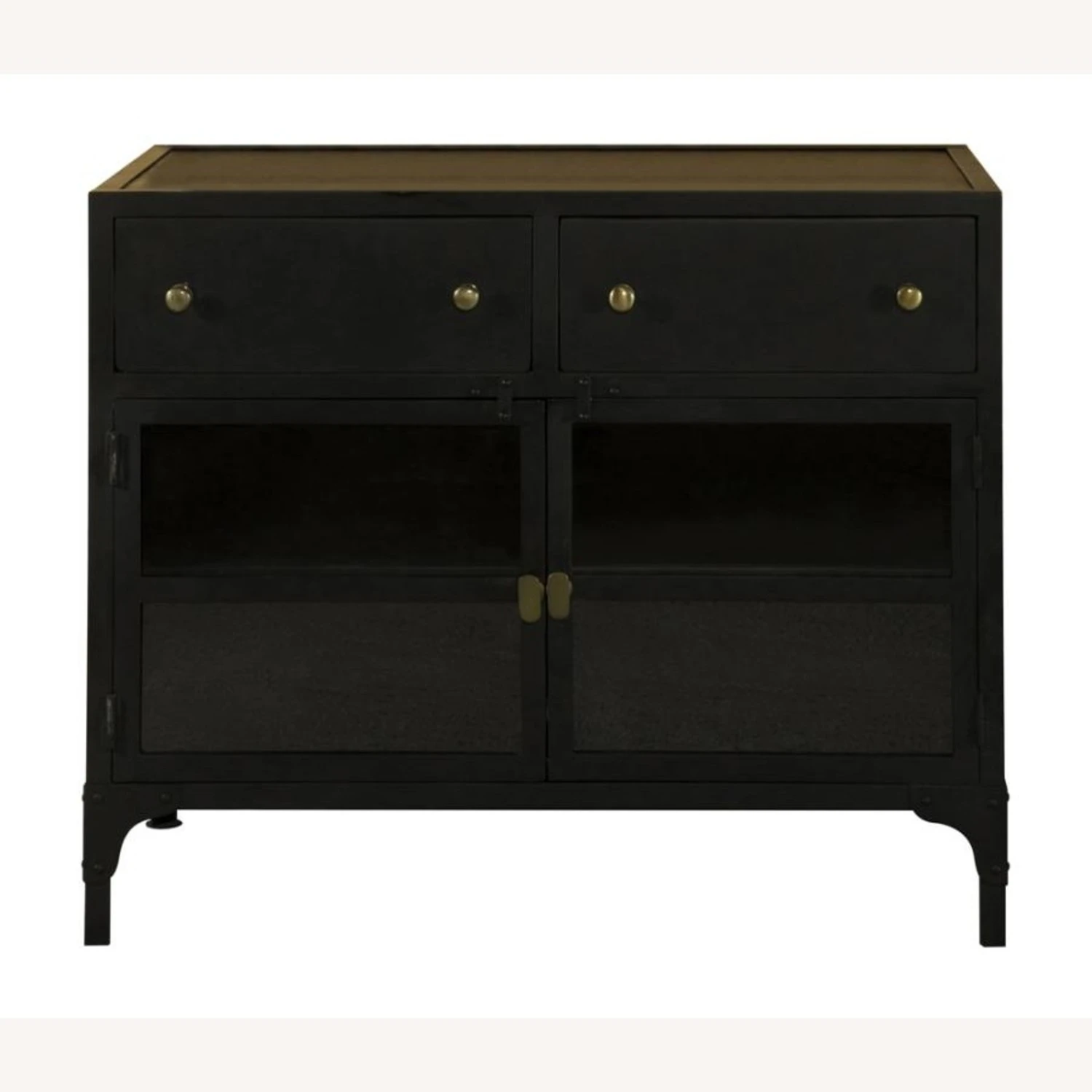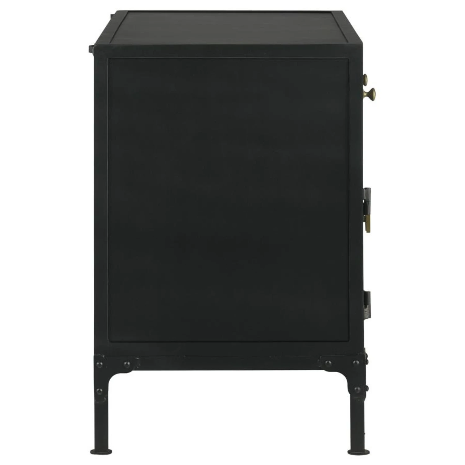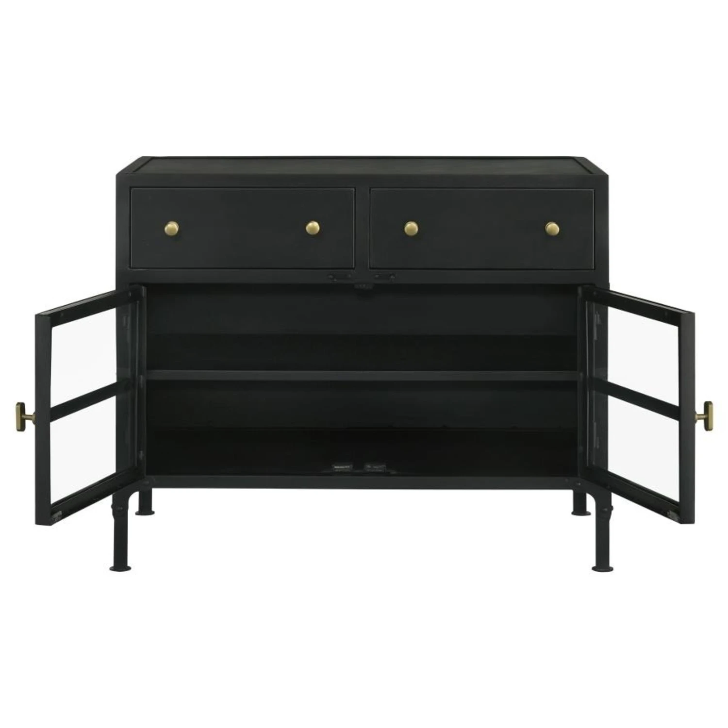 • Industrial inspired accent cabinet features a matte black metal finish and tempered glass