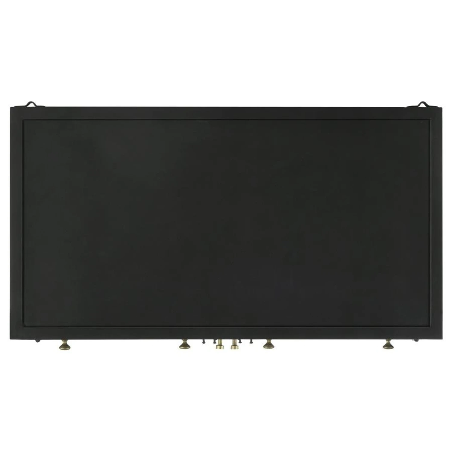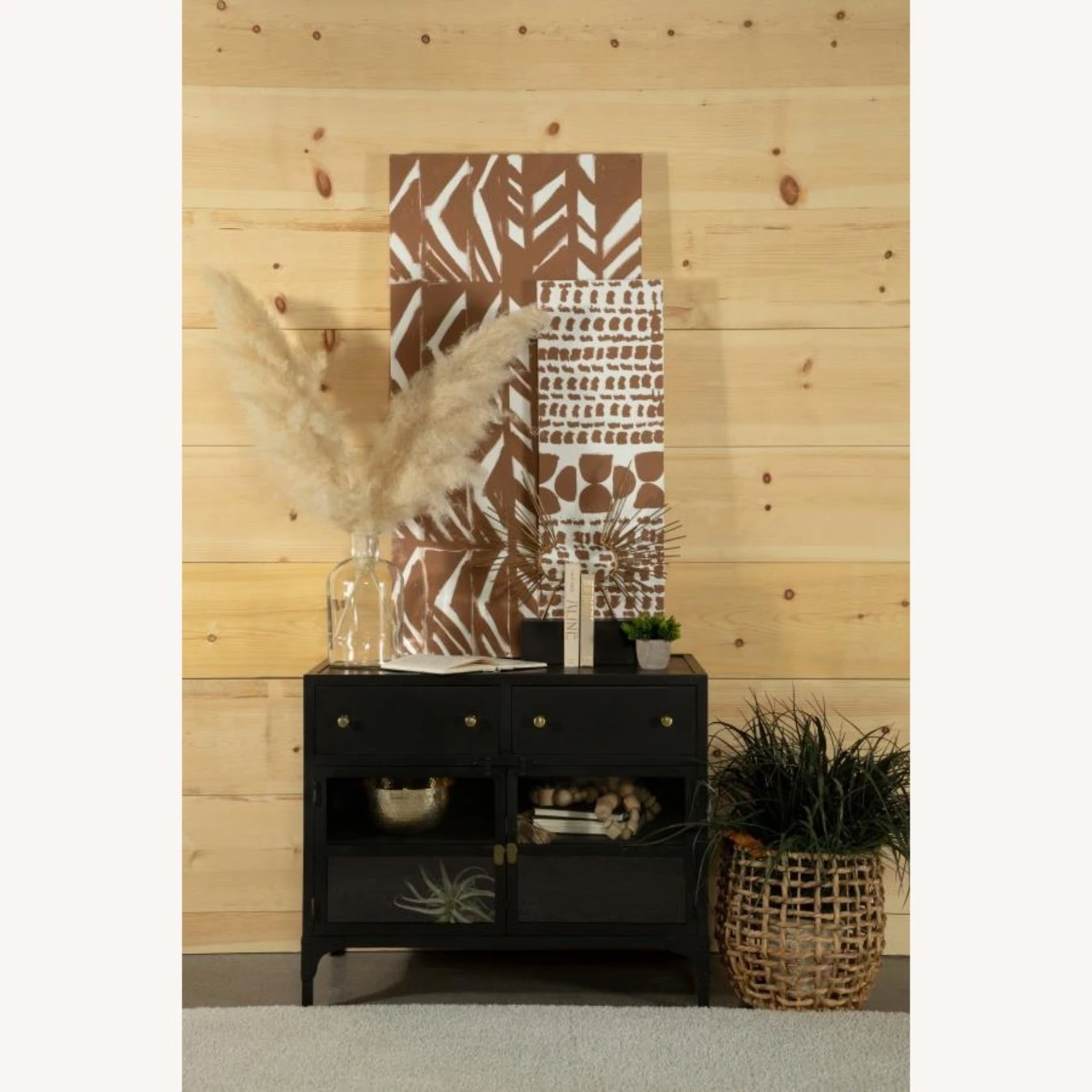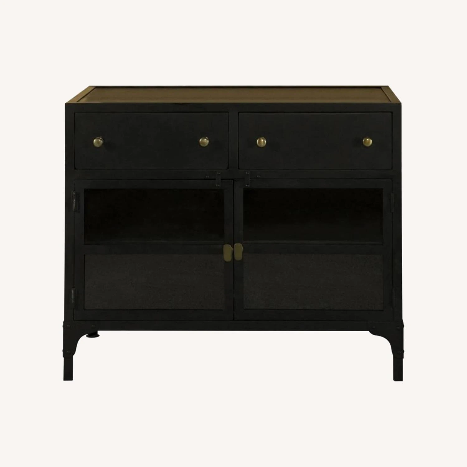 • Industrial inspired accent cabinet features a matte black metal finish and tempered glass