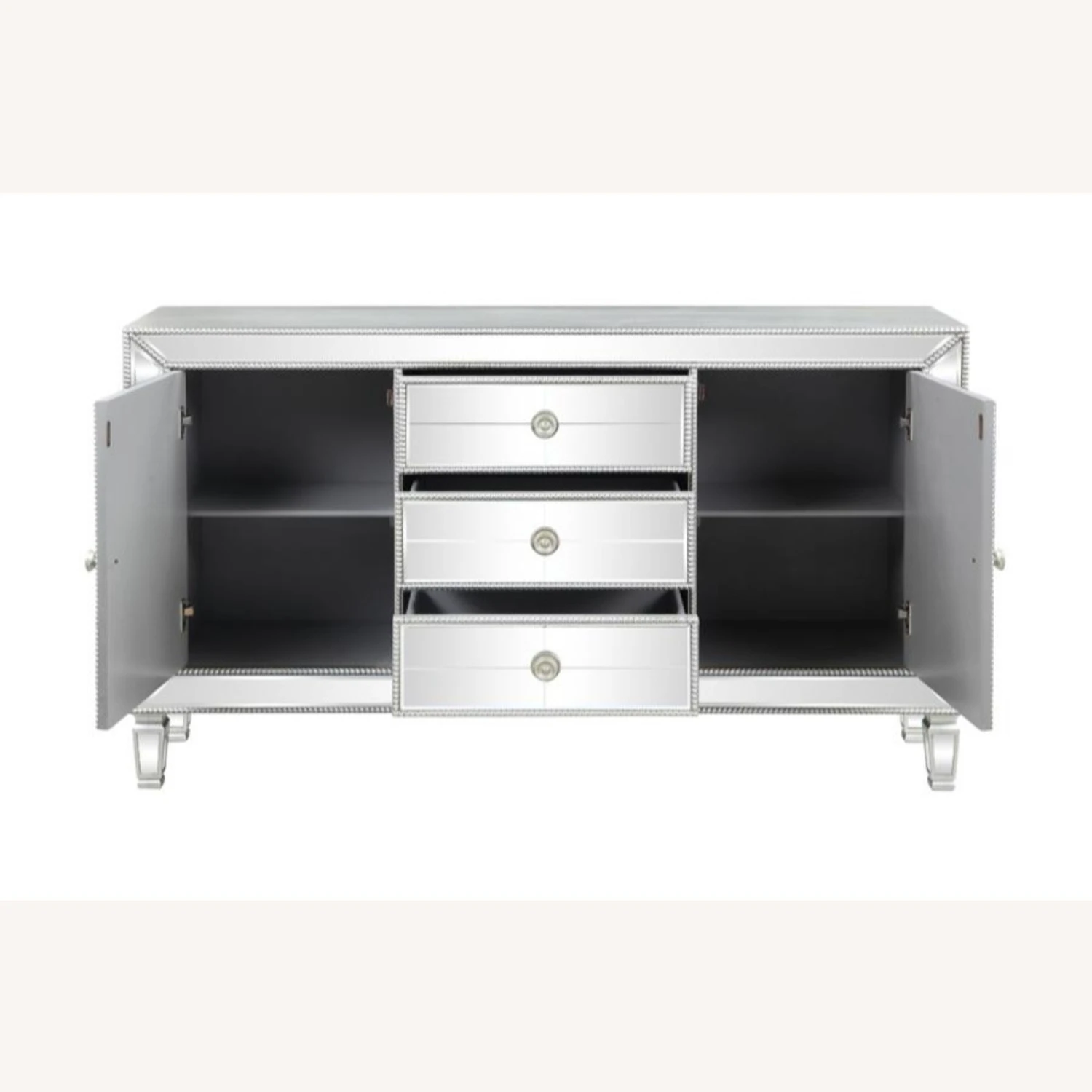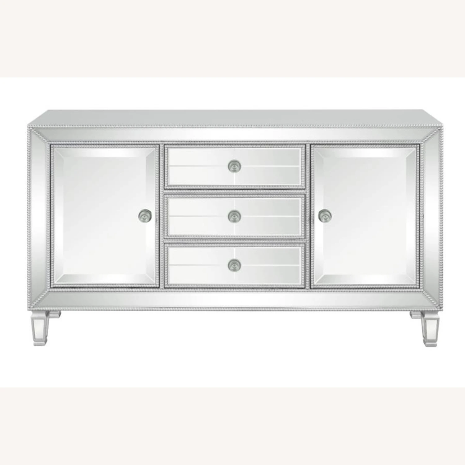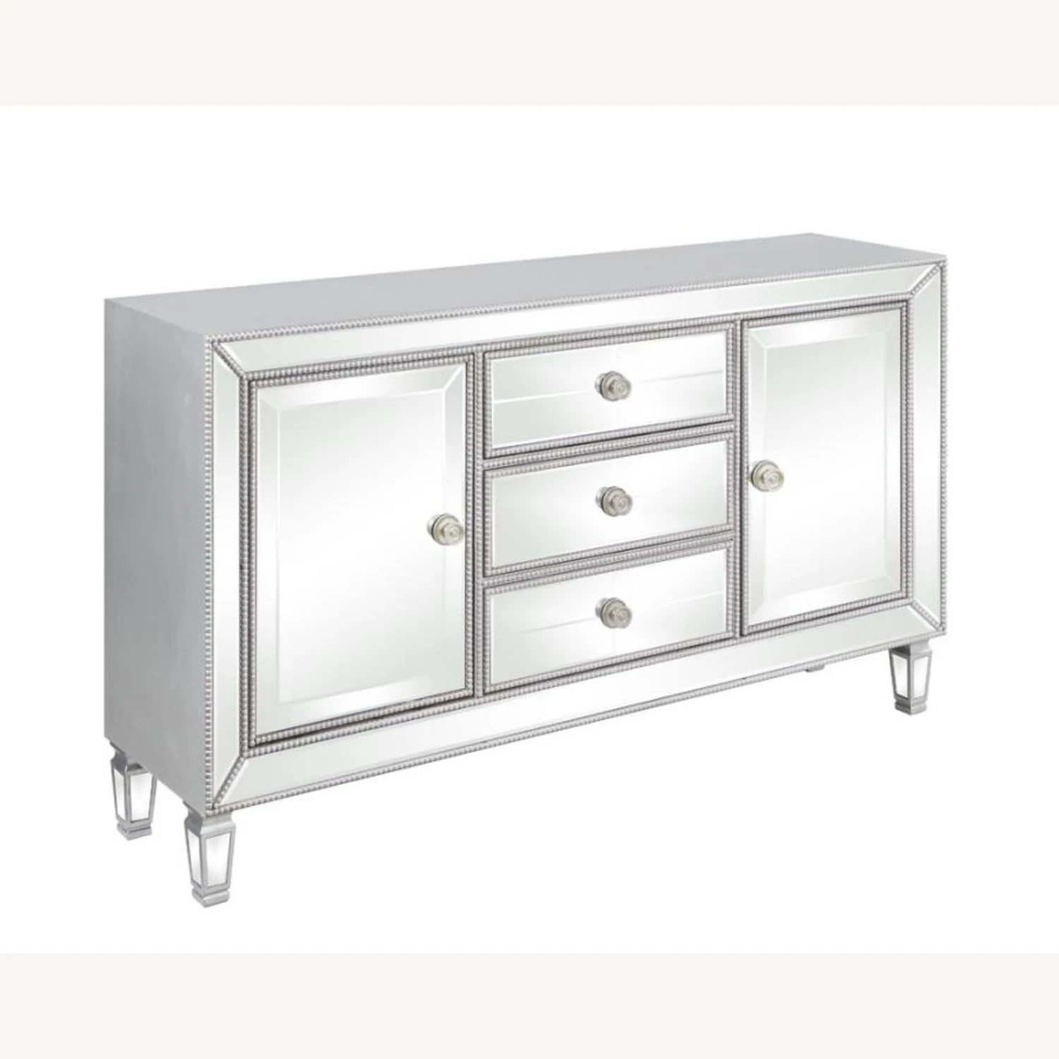 • Front mirror doors dress and three center drawers dress up this contemporary accent cabinet