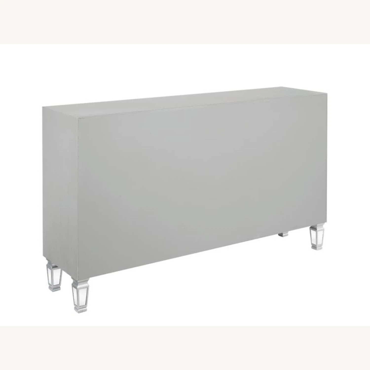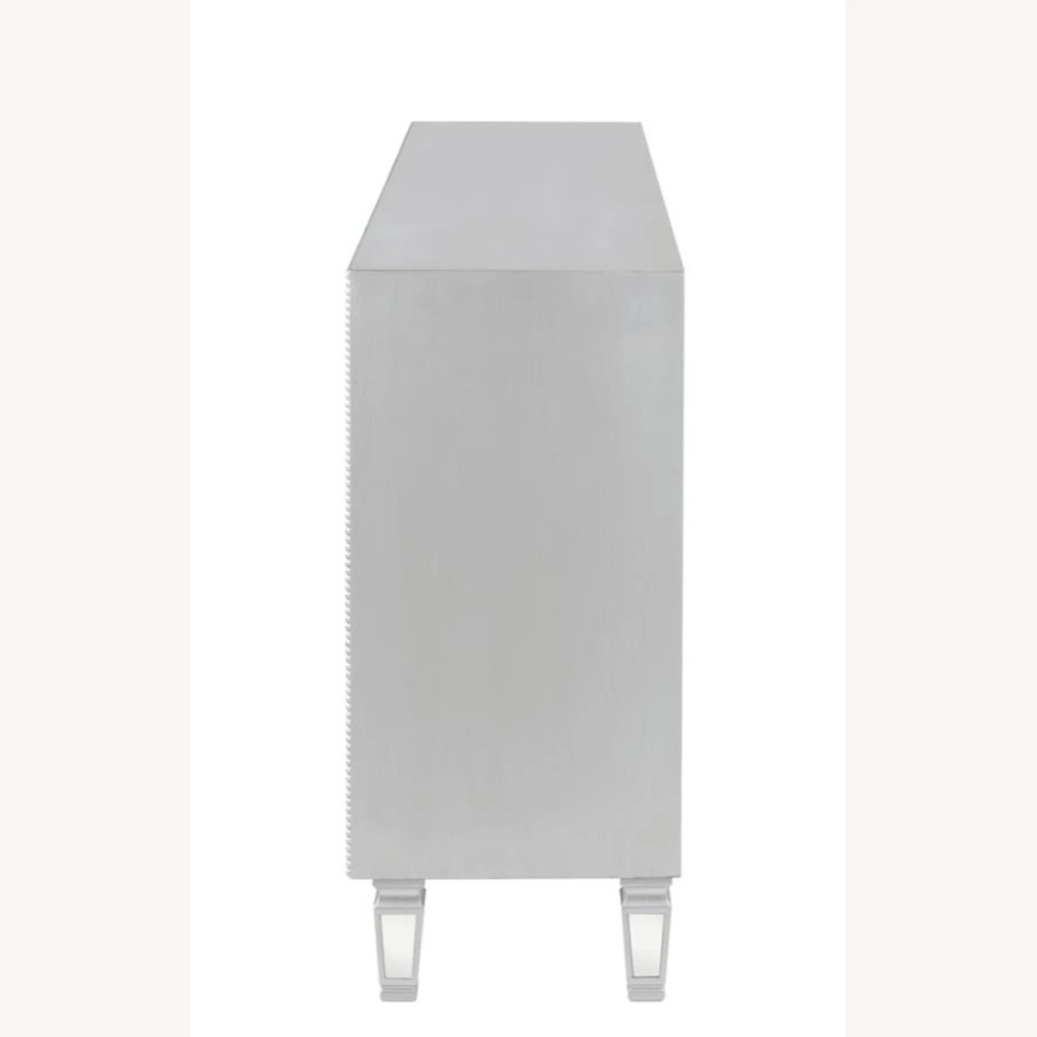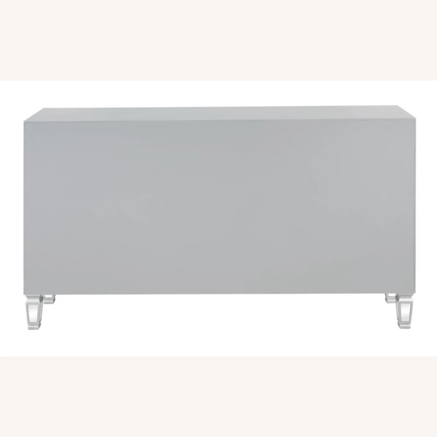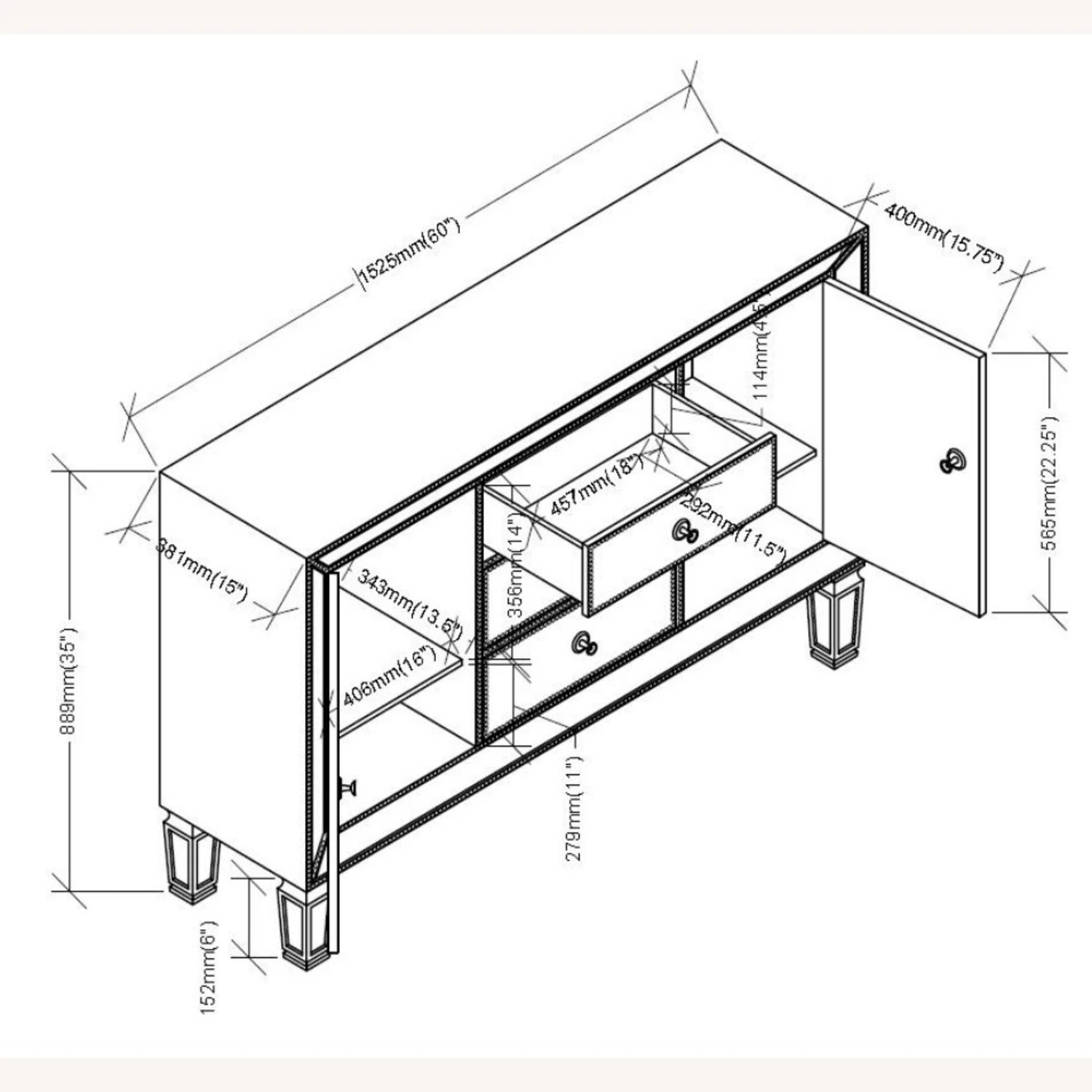 • Front mirror doors dress and three center drawers dress up this contemporary accent cabinet