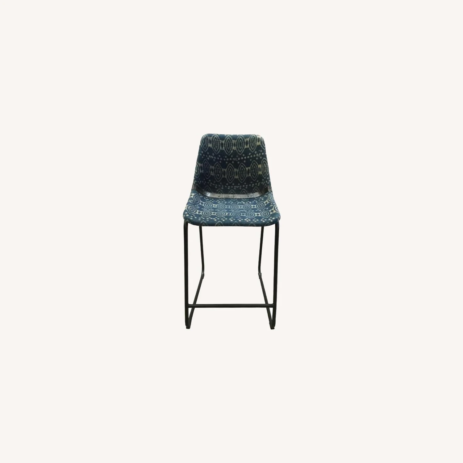• Our counter height stool is upholstered with a Bohemian woven fabric on the front and black leather its back.