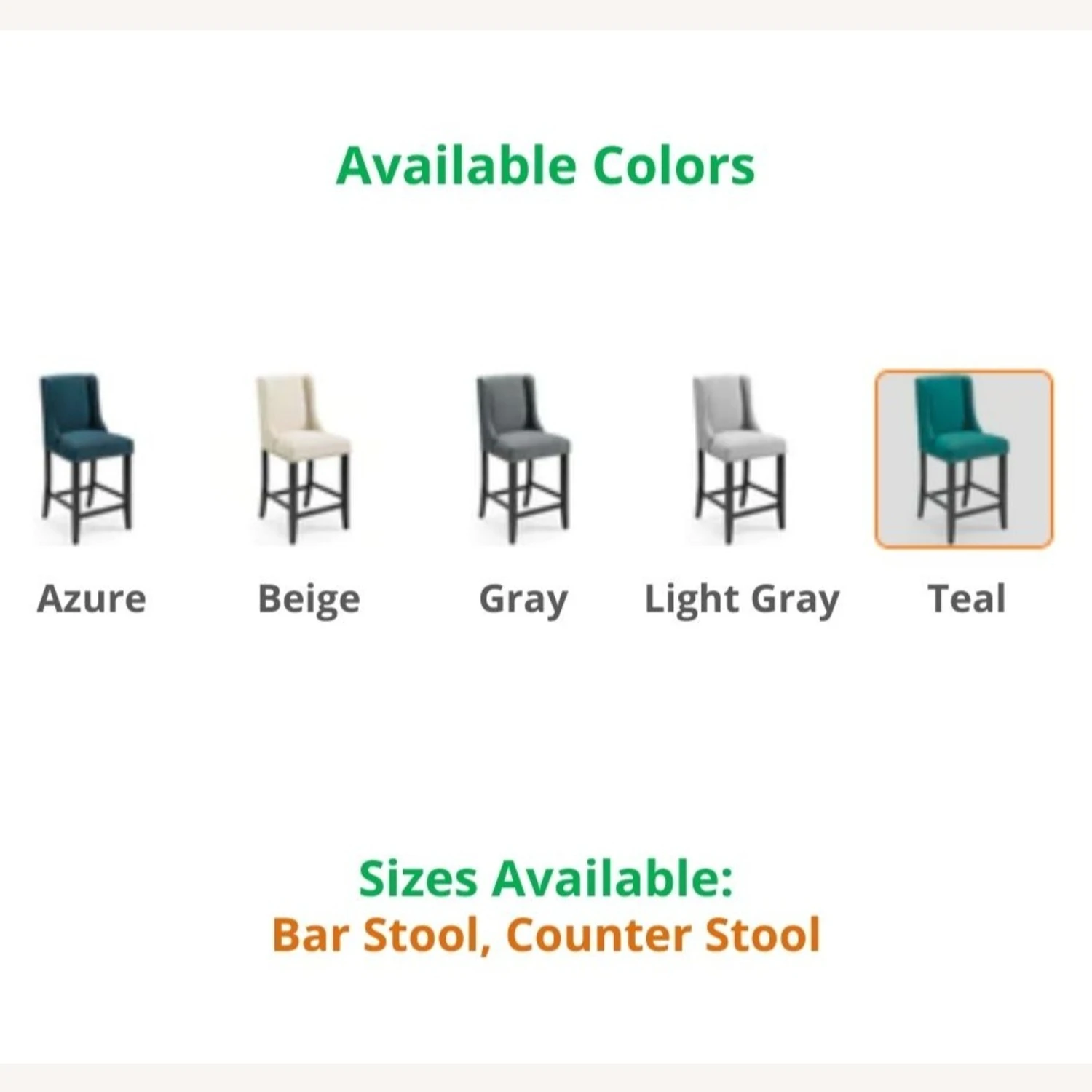 This model comes in these colors: AZURE, BEIGE, GRAY, LIGHT GRAY, & TEAL, and these sizes: BAR STOOL & COUNTER STOOL. If you are interested in a color/size other than that of this listing, and if the quantity you wish to purchase is greater than what is listed here, please message us for availability.