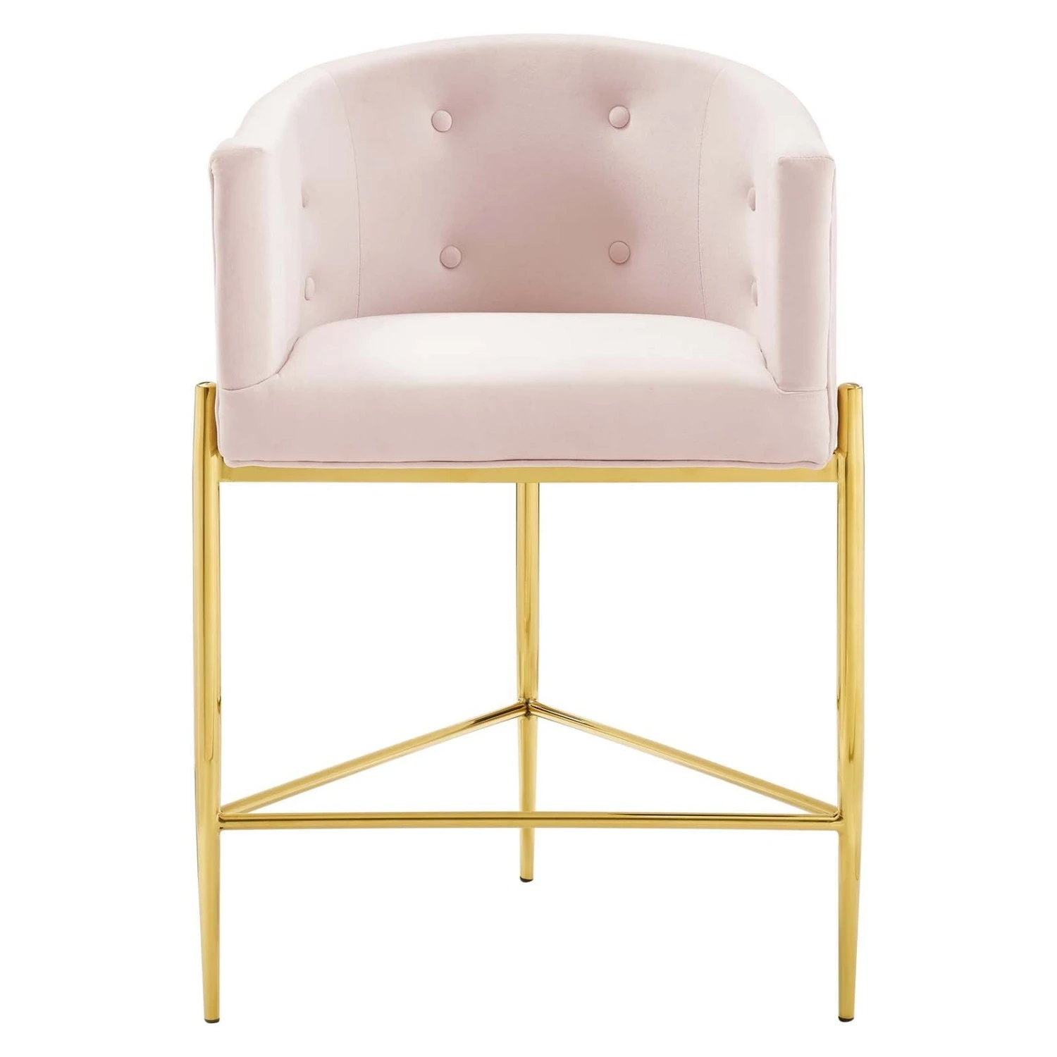 • Resting on a chrome gold tubular stainless steel frame, this versatile counter stool has interior button tufting and a charming curved shape.