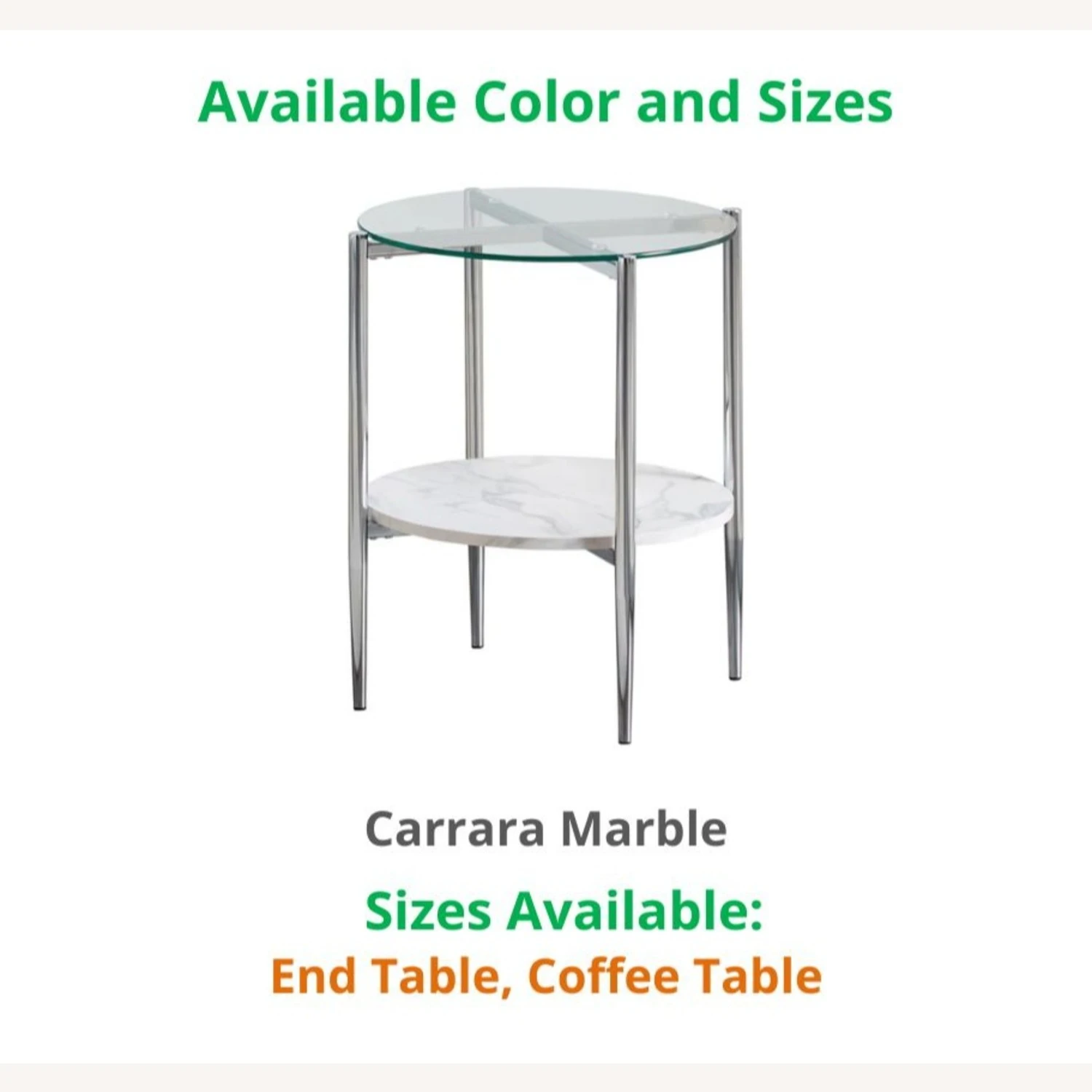This model comes in this CARRARA MARBLE, and these sizes: END TABLE and COFFEE TABLE. If you are interested in a color/size other than that of this listing, and if the quantity you wish to purchase is greater than what is listed here, please message us for availability.
