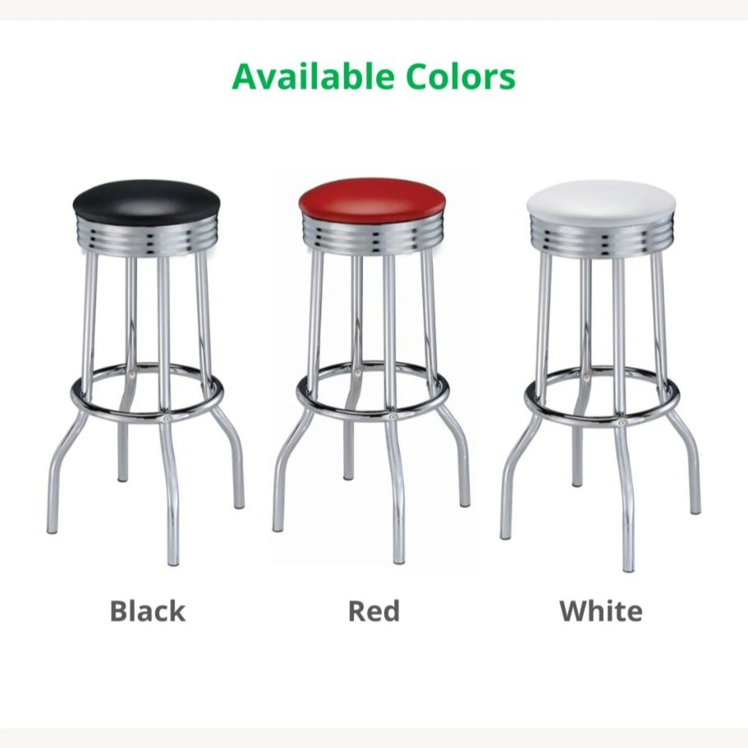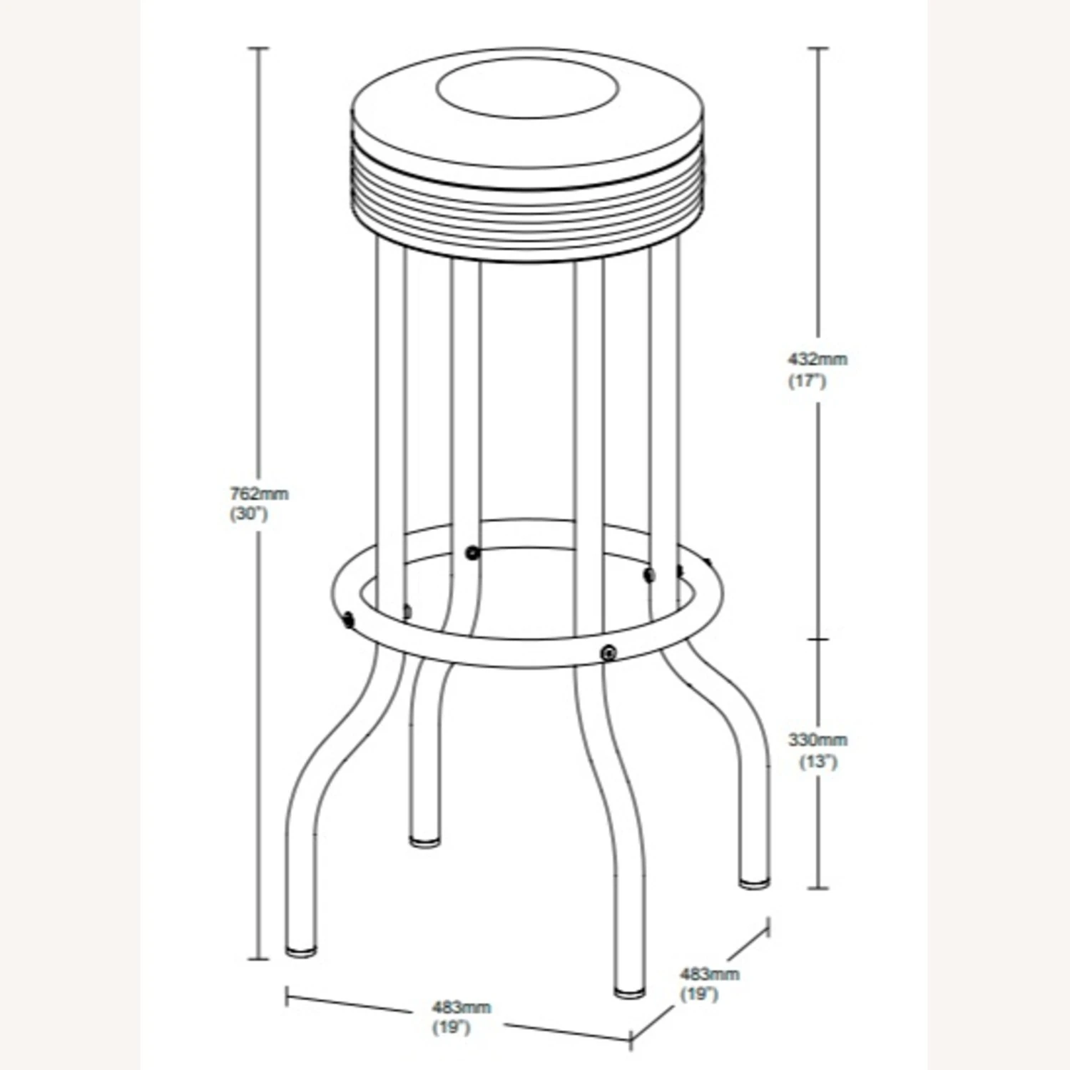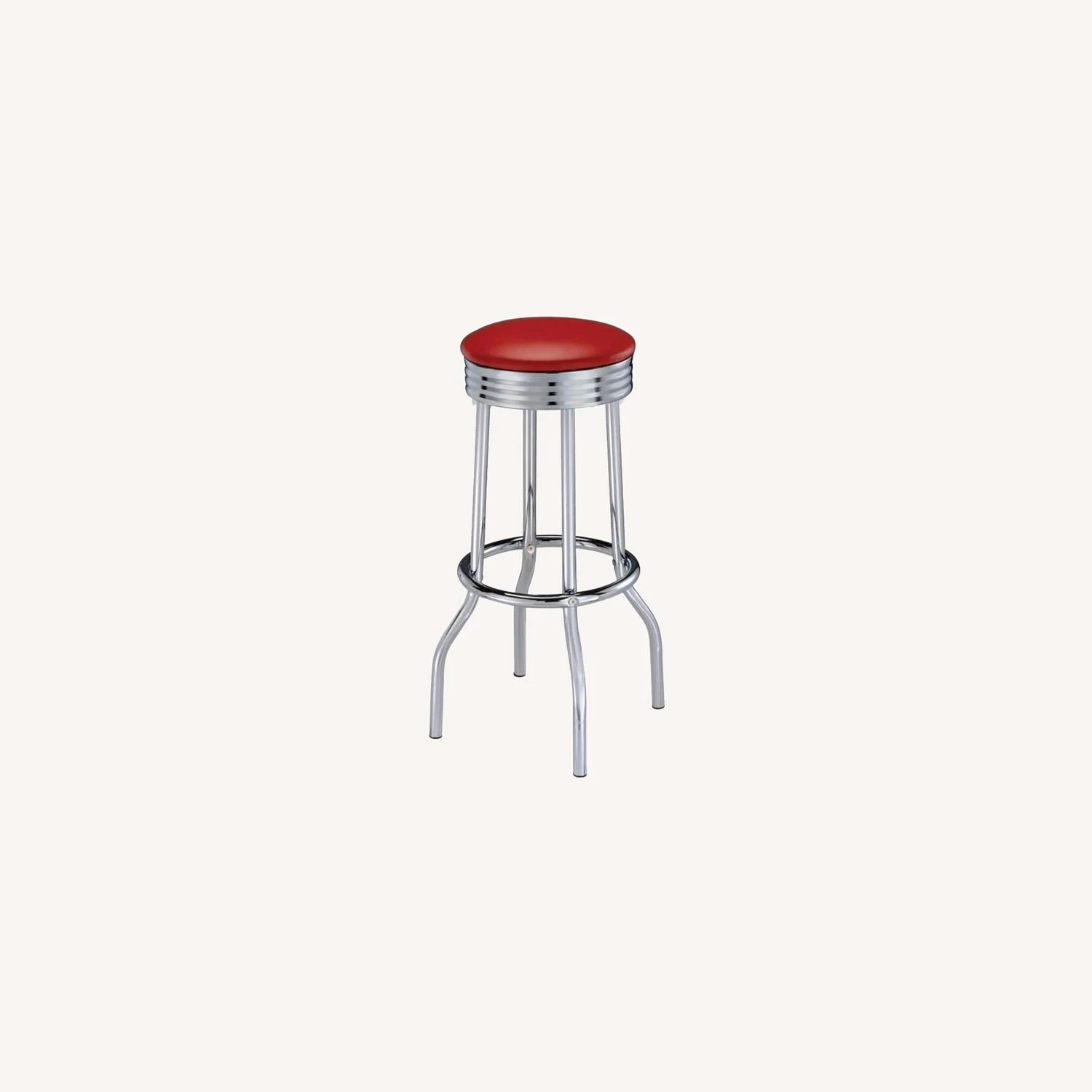 • Red faux leather upholstery and polished chrome legs give this bar-height stool a flexible style that works well with a variety of interior themes.