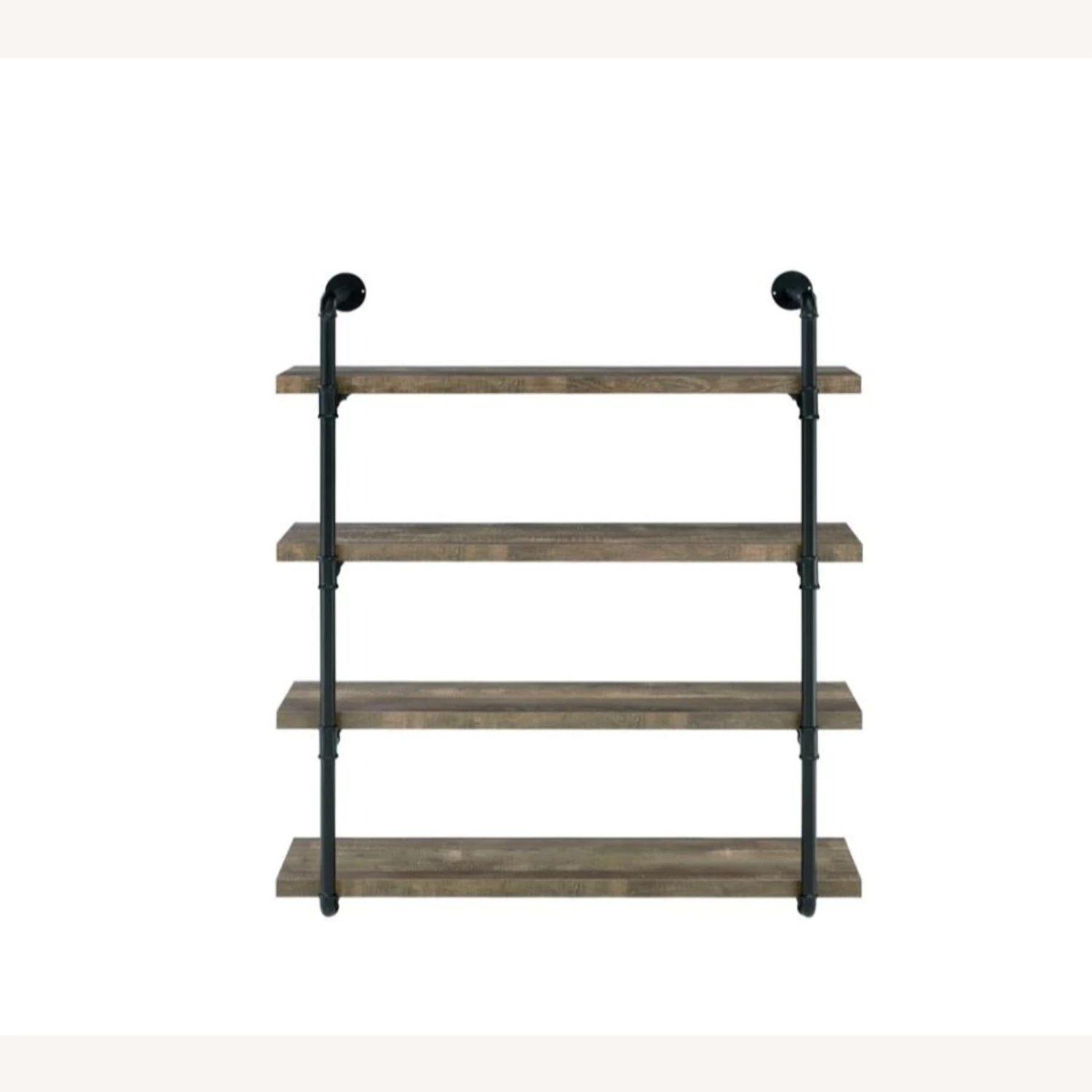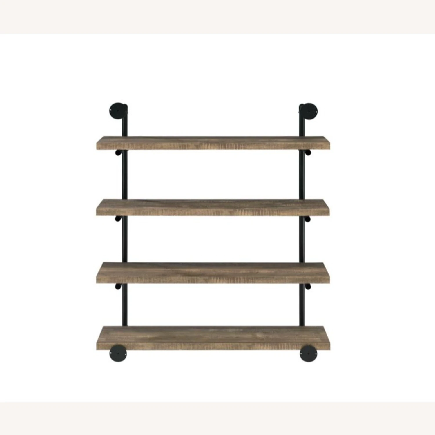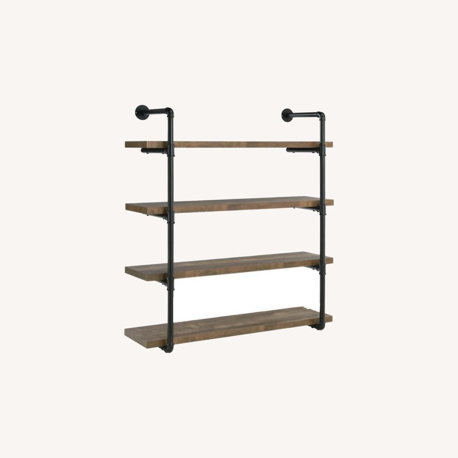 • Industrial style wall-mounted shelf in rustic oak finish with black plumbing pipe metal frame