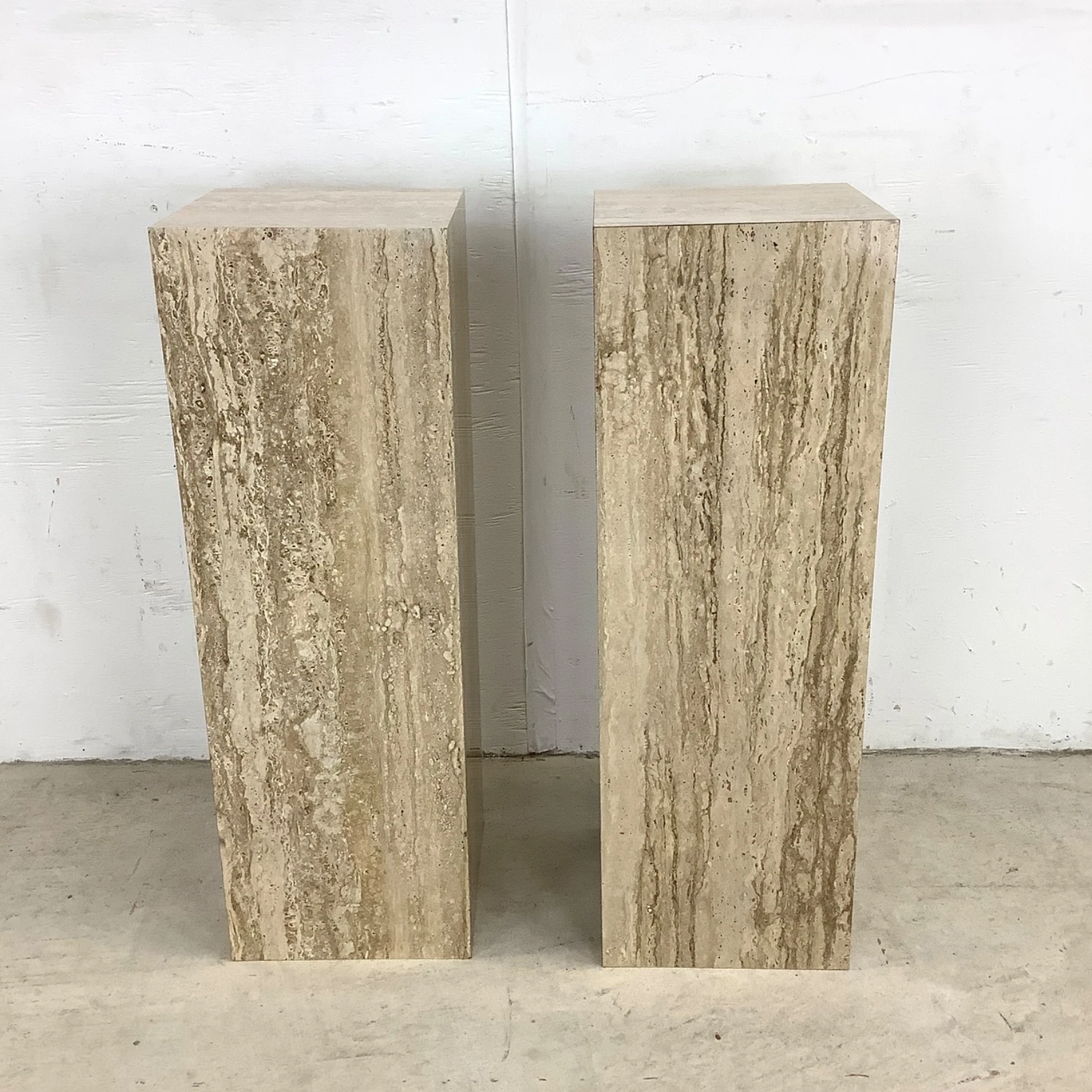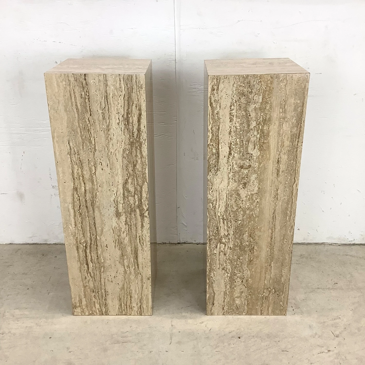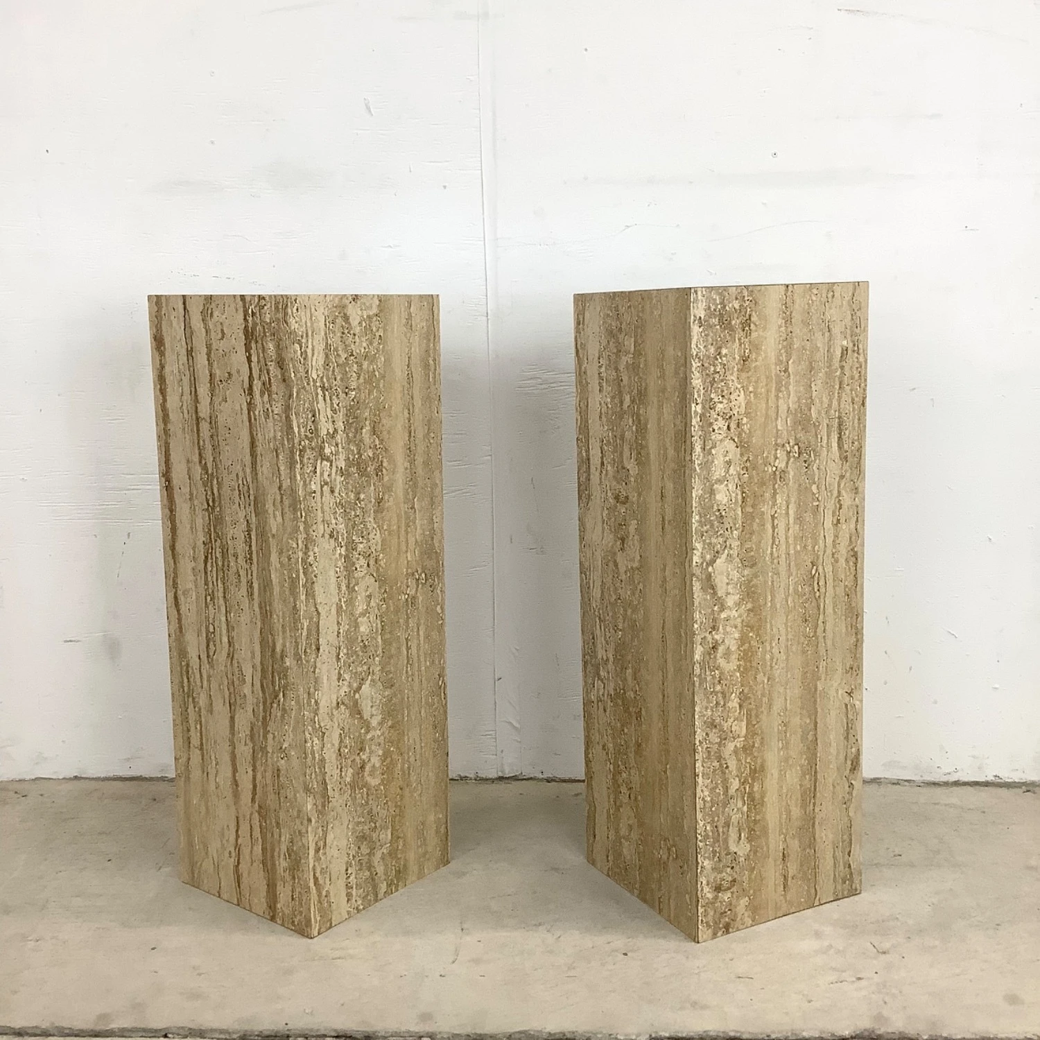 Seller’s Notes: This matching pair of vintage modern display pedestals feature durable faux stone laminate finish and clean modern lines. The pair stands thirty inches tall and make an ideal set of accent display tables for home or office, perfect for vase or sculpture display-
