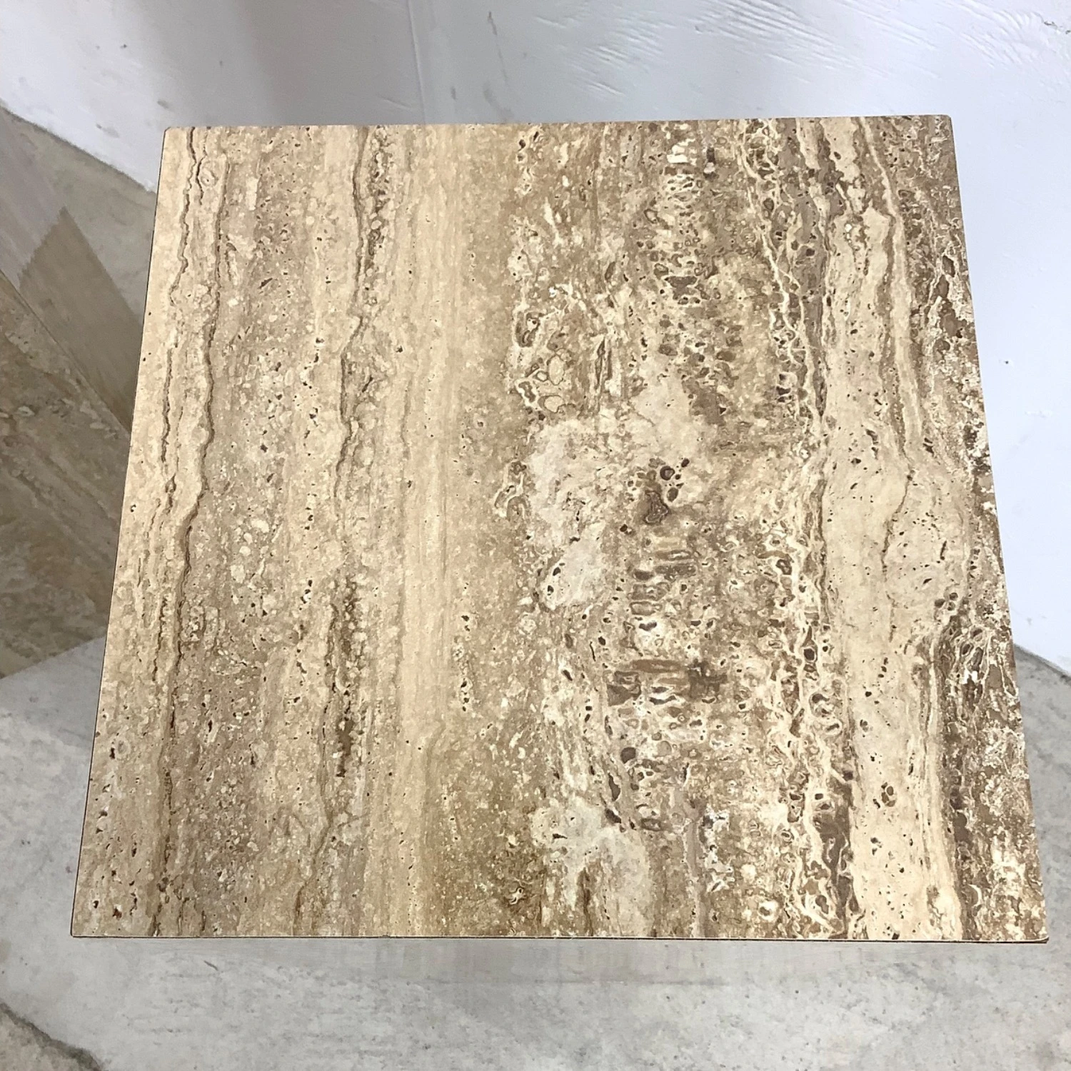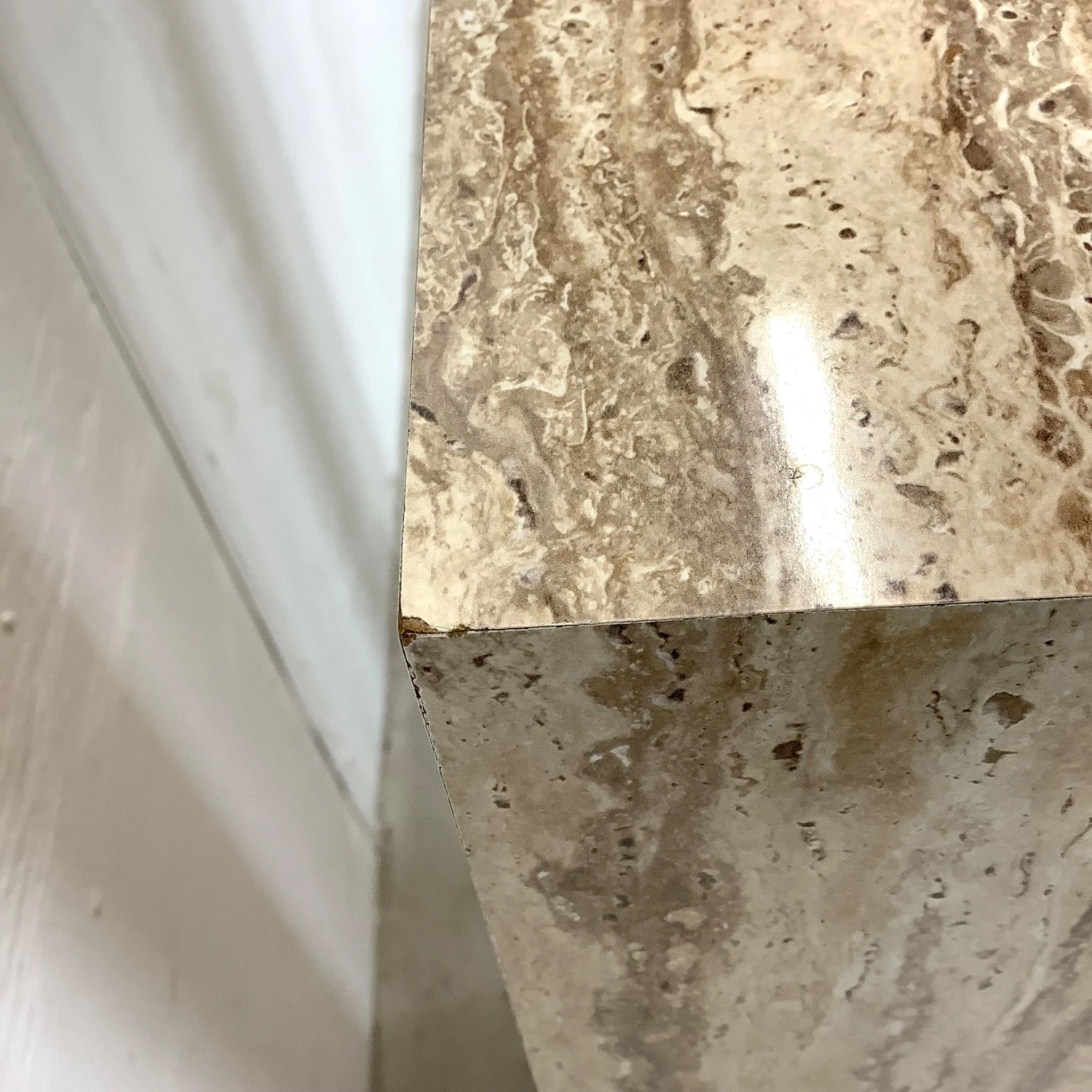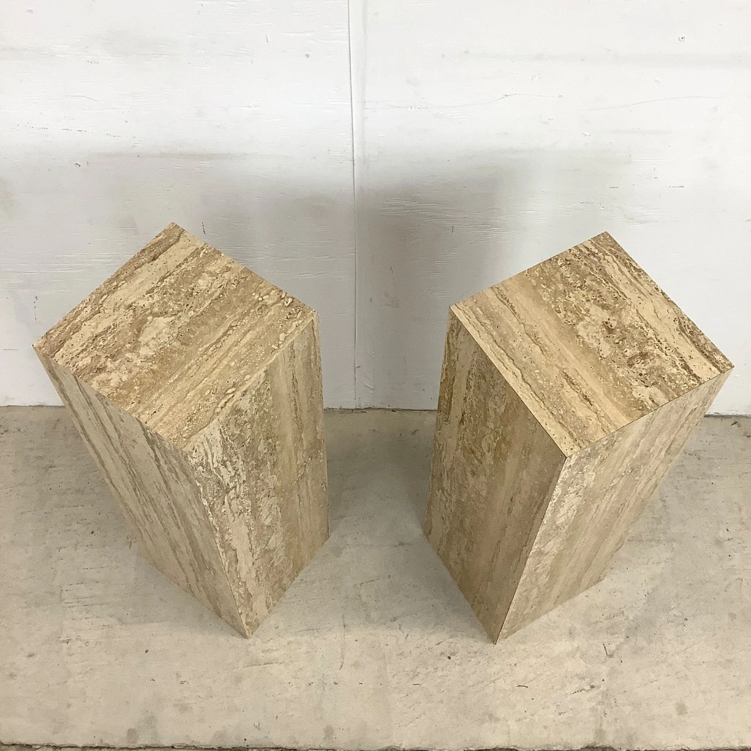 Seller’s Notes: This matching pair of vintage modern display pedestals feature durable faux stone laminate finish and clean modern lines. The pair stands thirty inches tall and make an ideal set of accent display tables for home or office, perfect for vase or sculpture display-
