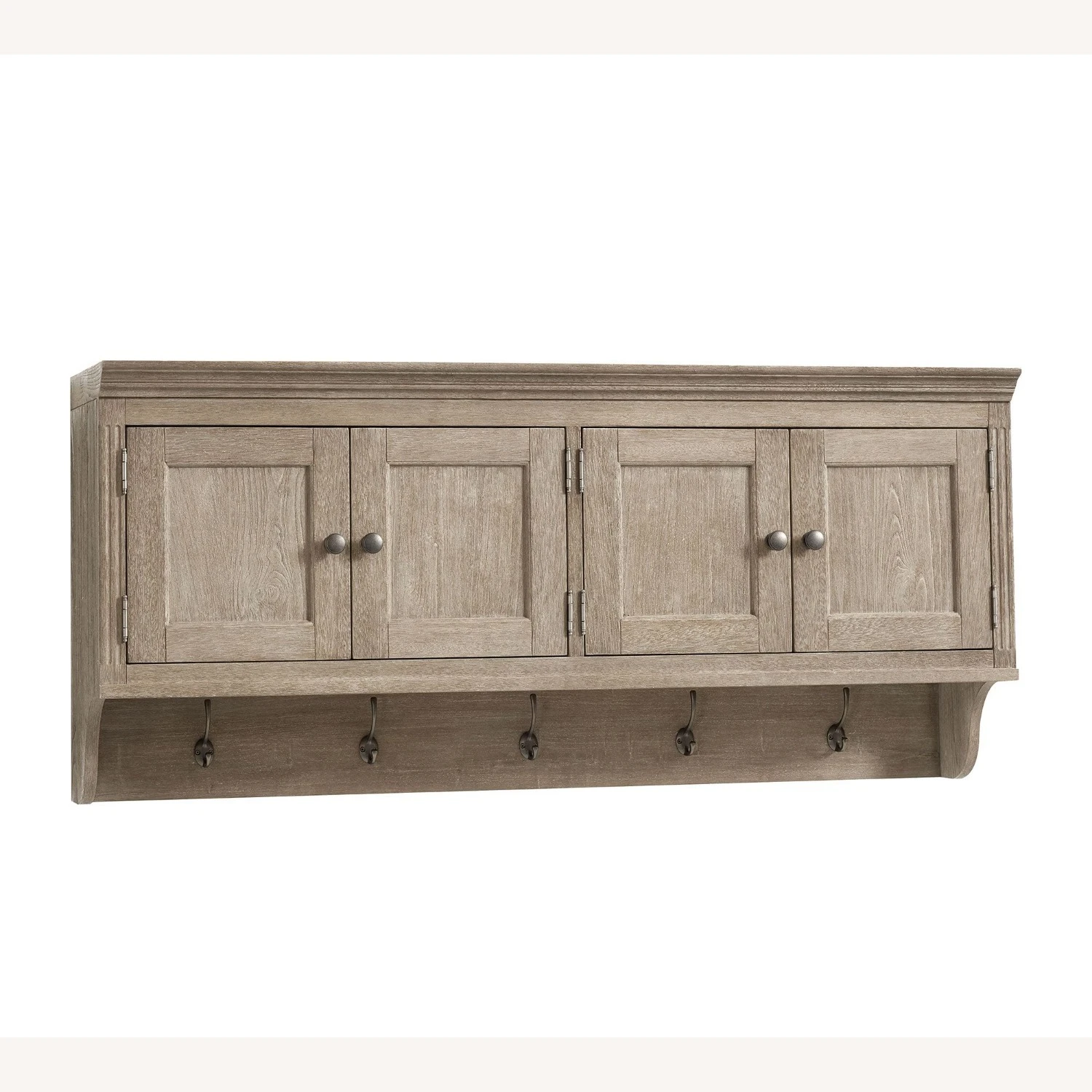Features 4 cabinet doors with 1 shelf behind doors and 5 hooks below cabinet.