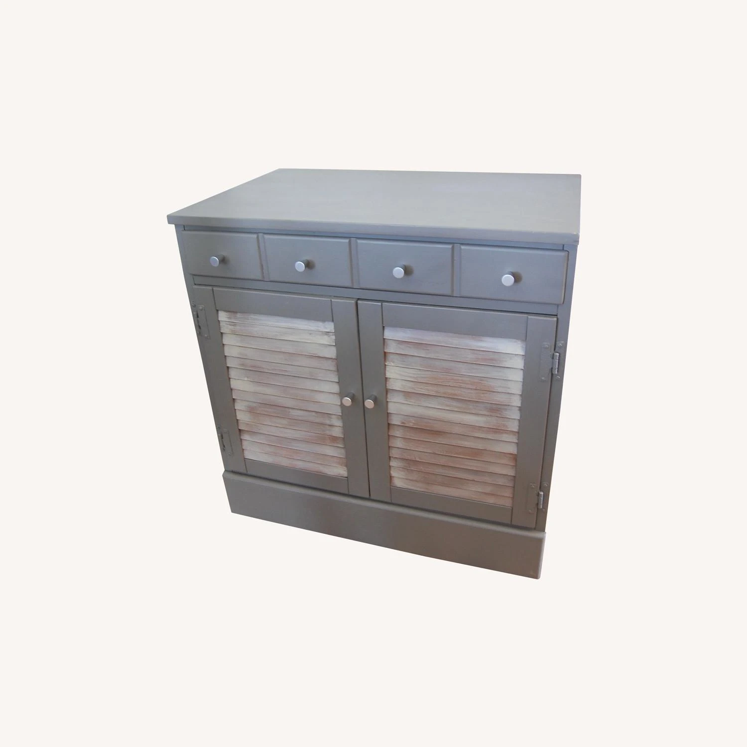 Seller’s Notes: Small 1970’s retro cabinet. This piece has beed updated with new gray finish. The louvered cabinet doors have been painted to yield a driftwood like finish. Features a drawer at above the cabinet doors. New cabinet door and drawer pulls have been installed. The interior of the cabinet space features one full width, full depth shelf in its original brown painted finish. Perfect for anywhere you need some storage! in a kitchen, pantry, entry hall, closet organizer, bath or even you bedroom!