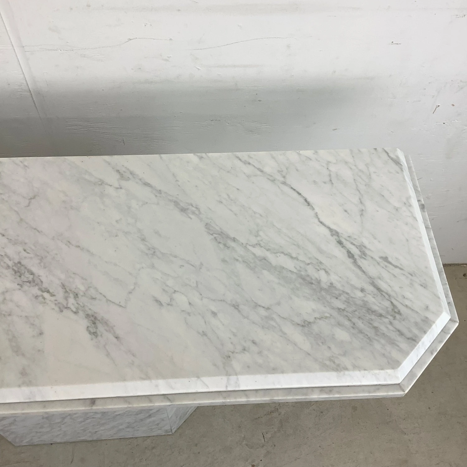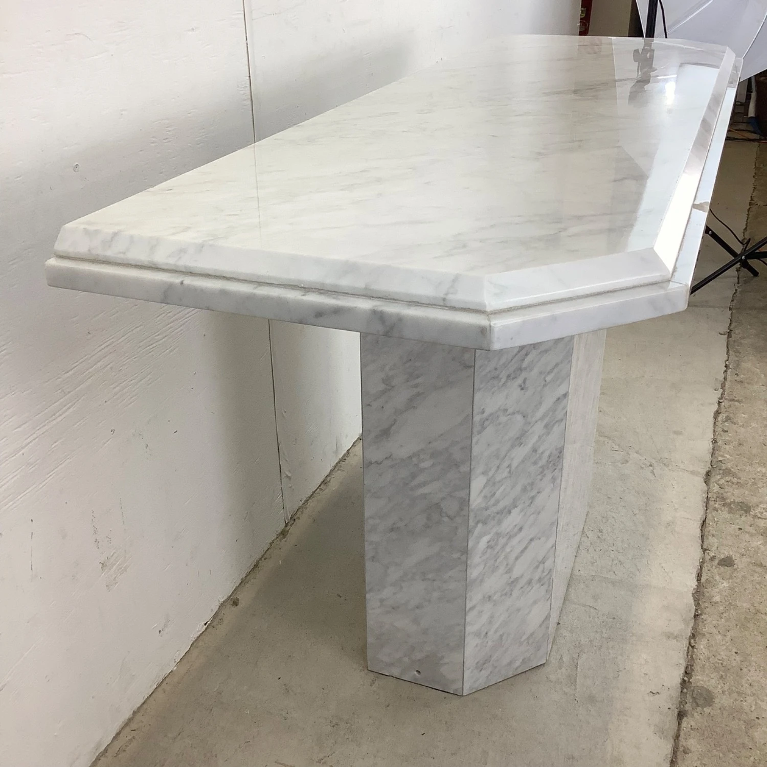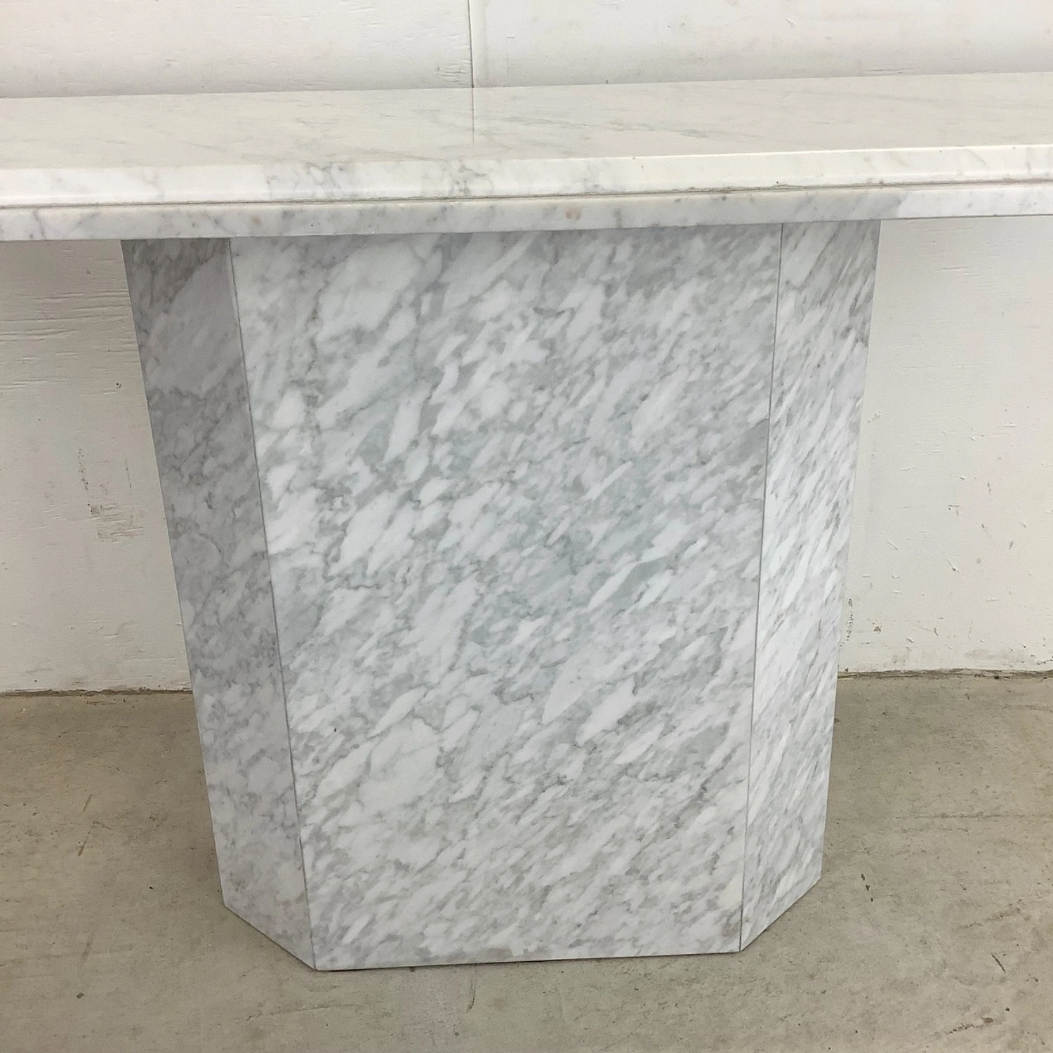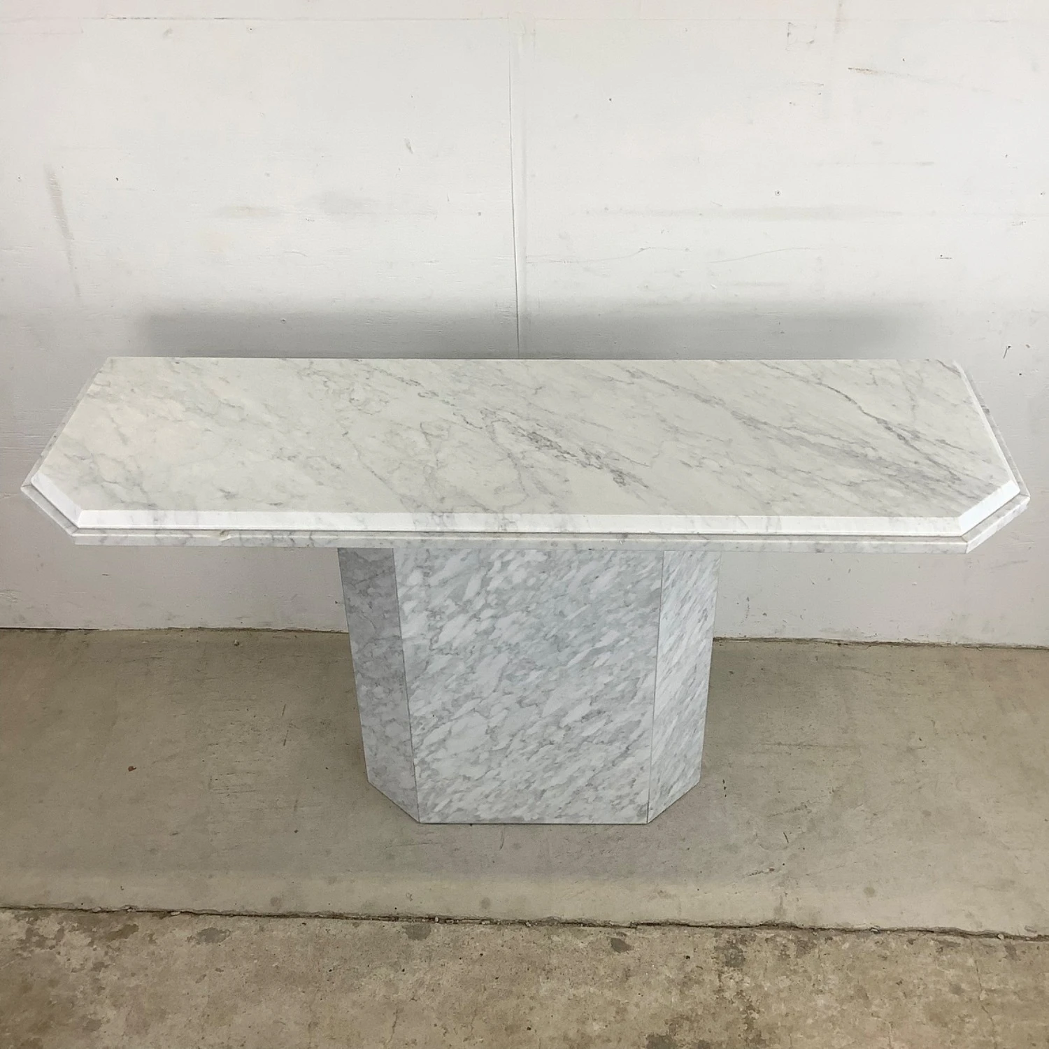 Seller’s Notes: This stunning marble console table features HEAVY Italian modern construction with beautiful finish and shapely beveled edge. The impressive size of this thick stone console table makes it a substantial addition to entryway, hall, or otherwise.